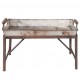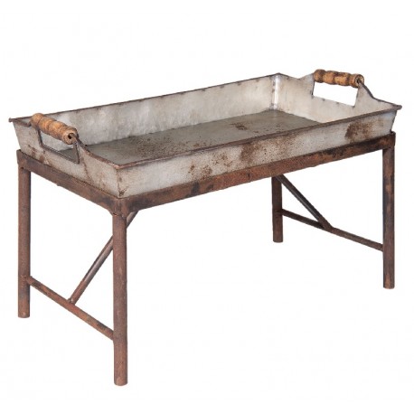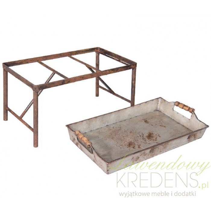 Taca metalowa z metalowym stelażem od razu przykuwa uwagę niecodziennym wyglądem. Liczne postarzenia wpasowują mebel w kategorie stylowych aranżacji vintage. Prostokątna, srebrna taca vintage z drewnianymi uchwytami wsparta na ciemnobrązowym stelażu dopasuje się w szczególności do wnętrz praktycznych. Odważ sie na odrobinę awangardy i zdecyduj się na tace metalowe Clayre&Eef!
