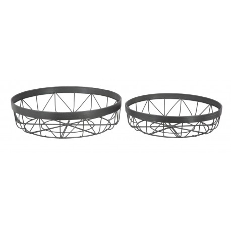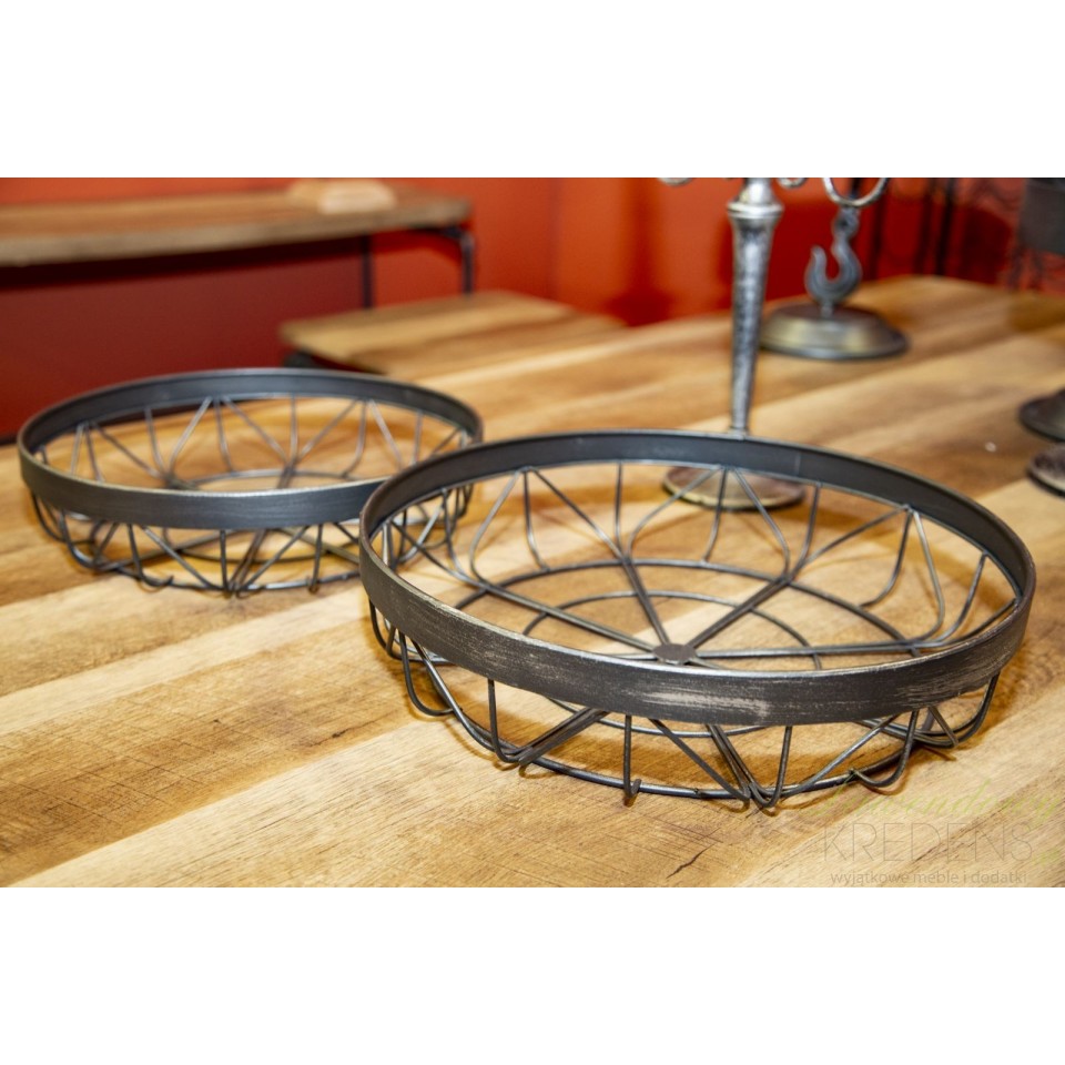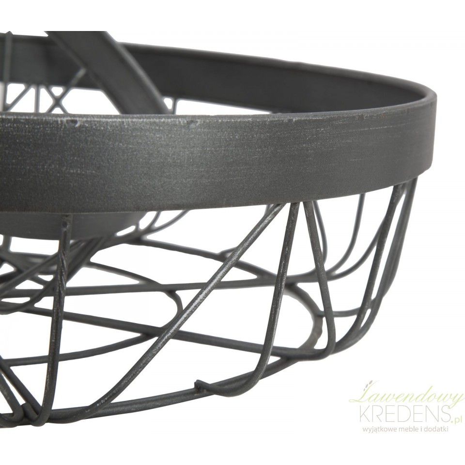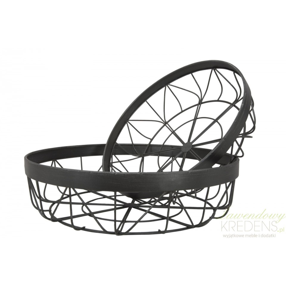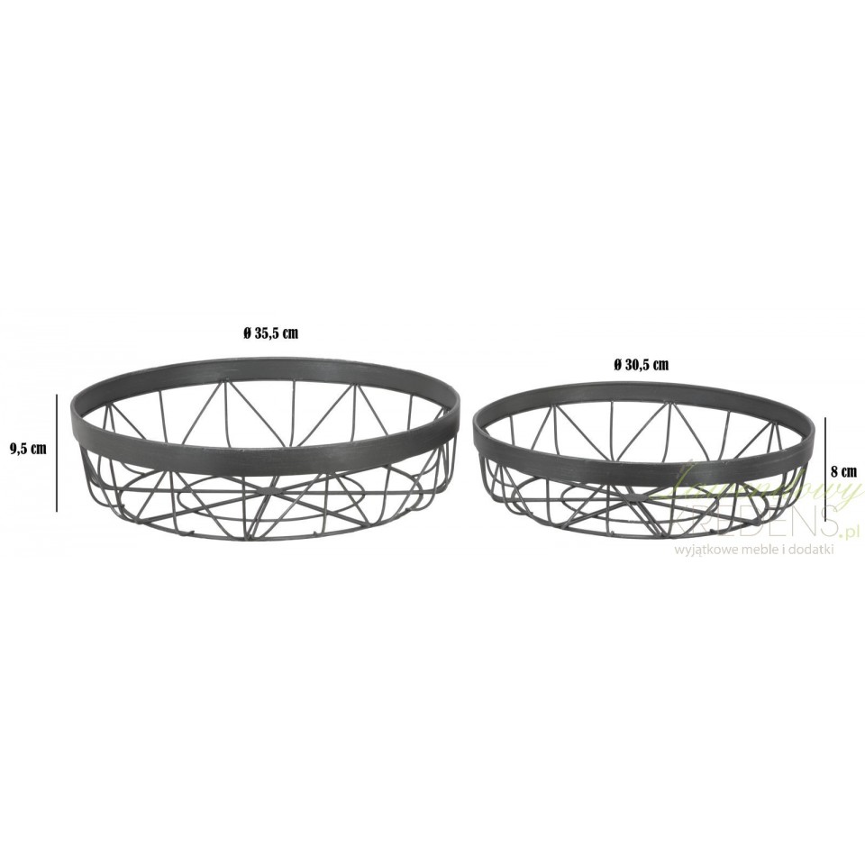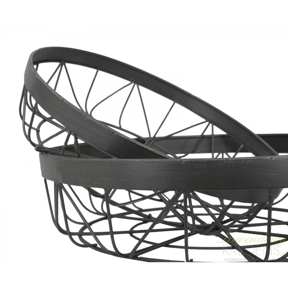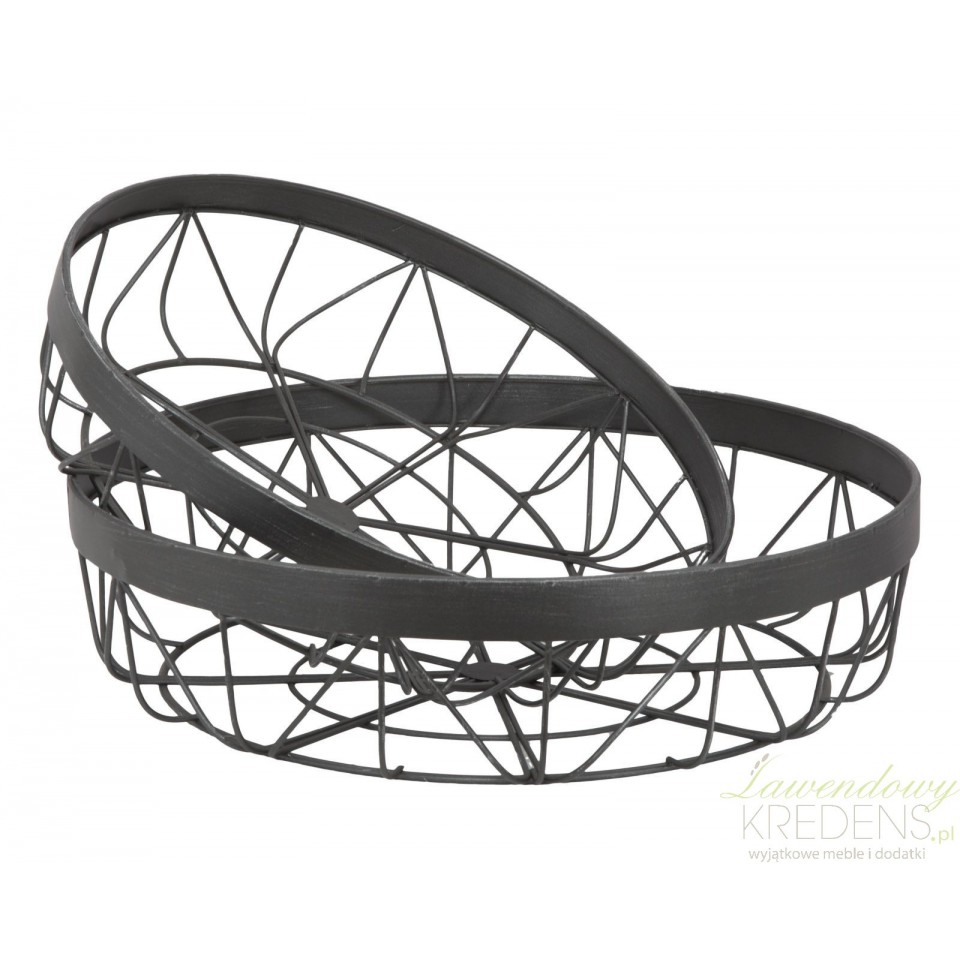 Dwa, czarne kosze metalowe w stylu industrialnym sprawdzą się w roli pojemnika na owoce, przy okazji będąc modną ozdoba domu.