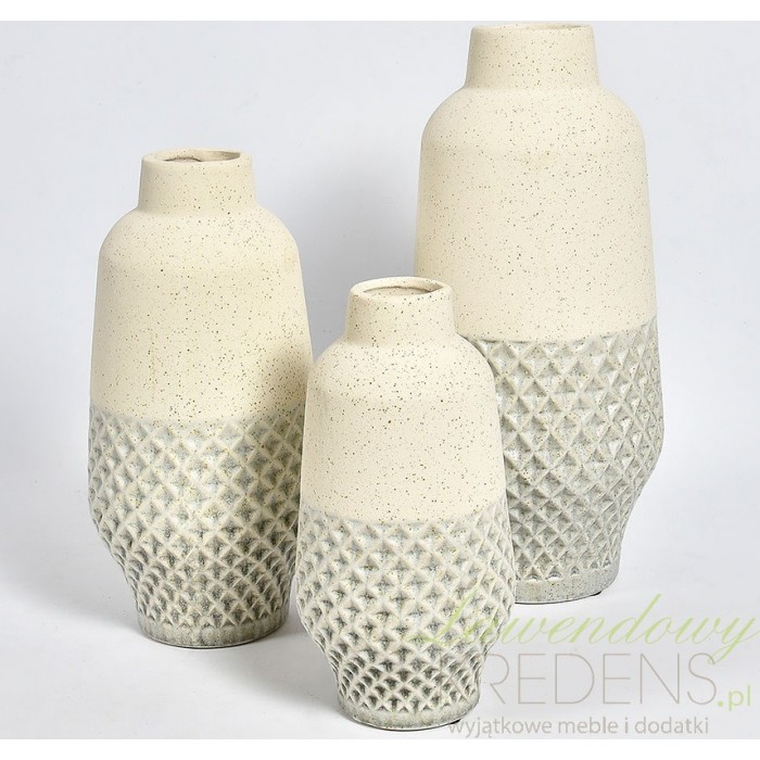 Wazon Belldeco jest wysoki na ponad 40cm i ma oryginalny kształt z zwężeniem u góry. Jego piaskowy kolor doskonale sprawdzi się w wielu aranżacjach. Wazon ma do połowy wzór w romby, a górnej części jest gładki. Wazony Belldeco sprawdzą się w roli miejsca na świeże lub sztuczne kwiaty.