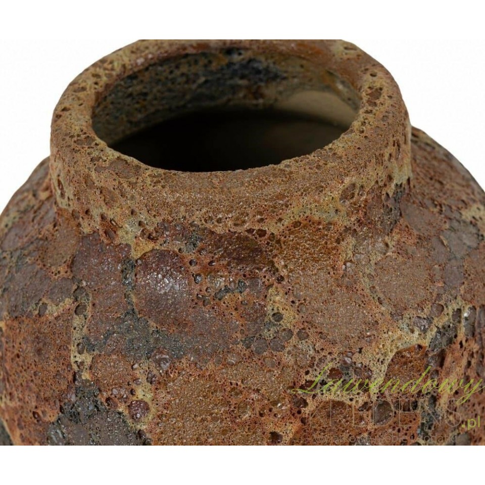 Gdy na balkonie hula przeciąg, lekkie osłonki potrafią się przesuwać lub przewracać, a kompozycja traci kształt. Tutaj pomaga masywniejsza bryła i szeroka podstawa, która stabilizuje całość nawet przy wyższych roślinach lub rozbudowanych bukietach. Polecam go szczególnie do miejsc narażonych na podmuchy: przy narożnikach tarasu, przy drzwiach wejściowych i w ciągach komunikacyjnych, gdzie dekoracja powinna stać pewnie.Rustykalna patyna i surowa tekstura – dekoracyjny wazon do traw, gałęzi i kompozycji sezonowych