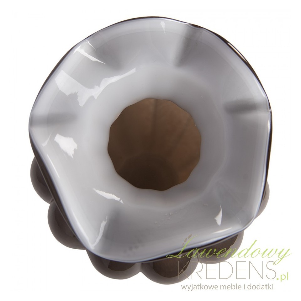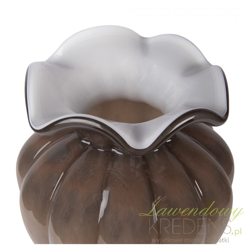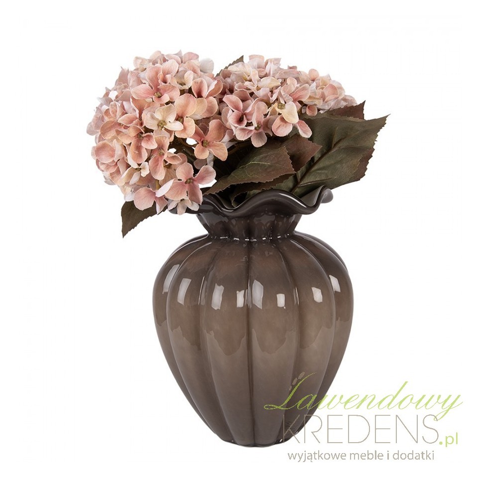 Jeśli masz dość wazonów, które wyglądają „płasko” na komodzie lub giną na tle ściany, ten model rozwiązuje problem od razu: **dymione szkło w odcieniu gliny** buduje głębię i podbija zieleń liści oraz jasne kwiaty. Polecam go do bukietów sezonowych, pojedynczych gałązek i kompozycji z suszków, bo przyciemnia tło i wydobywa strukturę roślin.Karbowany korpus i falowana szyjka – dekoracja, która robi efekt bez kwiatów