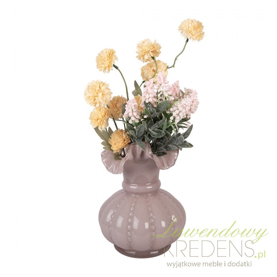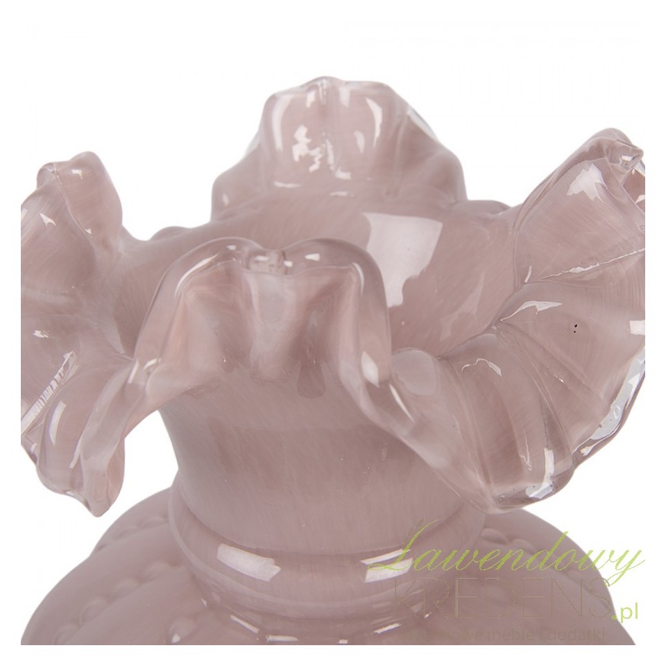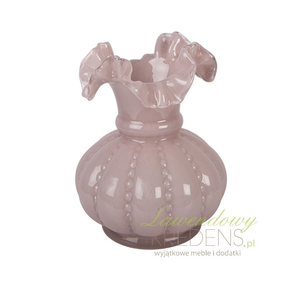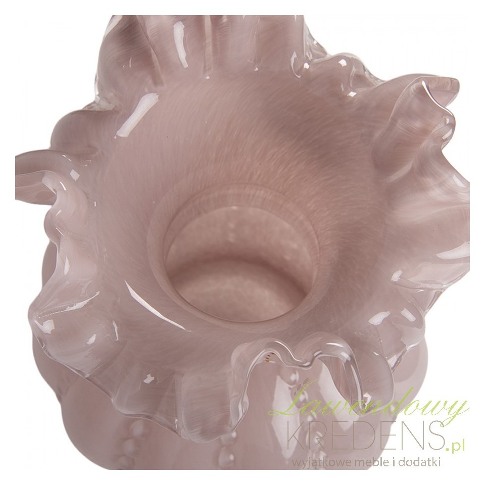 Najmocniejszy akcent to falowana, „pofalowana” krawędź, która nadaje kompozycji miękki, romantyczny kontur. Tłoczone wypukłości budują subtelną teksturę – wazon wygląda jak wykonany w duchu rękodzieła, ale pasuje też do nowoczesnych wnętrz, gdzie liczy się detal i światło. Półtransparentne szkło pięknie rozprasza refleksy, dzięki czemu dekoracja nie przytłacza przestrzeni.Dekoracja salonu, jadalni i sypialni w stylu vintage, shabby i klasycznym
