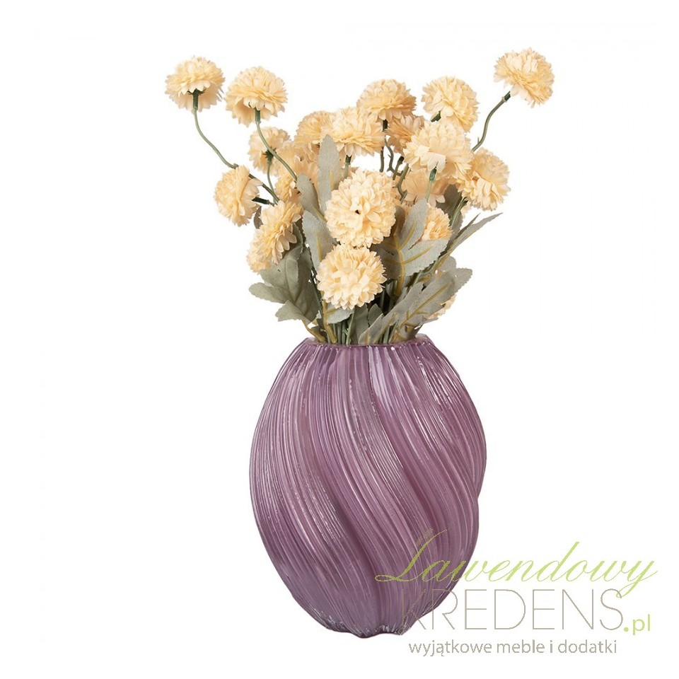 Jeśli układasz kompozycje z długich łodyg (tulipany, eukaliptus, trawy), często brakuje naczynia, które utrzyma formę bukietu i nie „ucieknie” na blacie. Ten szklany wazon M Clayre & Eef ma obłą, szeroką bryłę, dzięki czemu stoi pewnie nawet przy wyższych aranżacjach. Zwężany otwór pomaga zebrać łodygi w elegancki pion, więc bukiet wygląda schludnie bez dodatkowych wiązań.Teksturowane szkło w kolorze mauve – efekt rzemieślniczy i gra światła