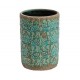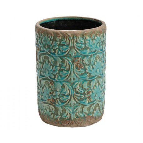 Ozdobny wazon Azzurro Old marki Belldeco, którego środkowa część ma kolor turkusowy, a linia przy dolnej i górnej krawędzi wazonu kolor brązowy. Turkusowa część wazonu to wypukłe, kwiatowe wzory o celowo postarzanej poprzez spękania i brązowe przetarcia powierzchni. Do wazonu dokupić można także donice Belldeco z tej samej kolekcji mające zbliżoną kolorystykę.