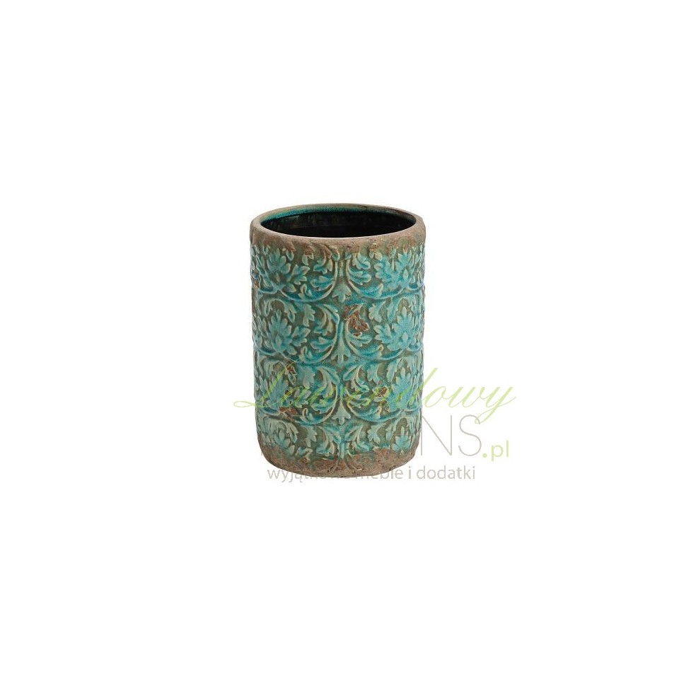 Stylowy wazon Belldeco z turkusowej kolekcji Azzurro Old na którym znajdują się wypukłe, kwiatowe wzory.