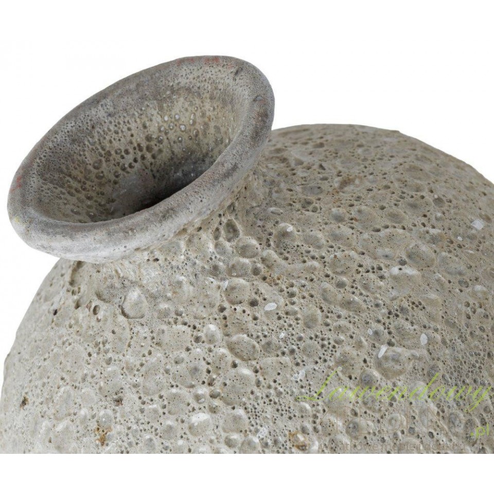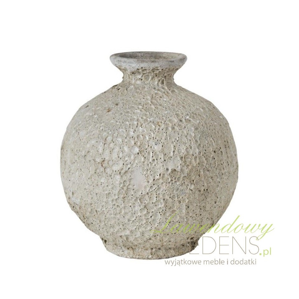 porowatą, kamienną fakturą i spokojną, neutralną tonacją, która doskonale wpisuje się w styl rustykalny, loftowy oraz nowoczesny minimalizm. Jego pękata forma z delikatnie wywiniętą szyjką tworzy wyrazisty akcent dekoracyjny – zarówno na tarasie, jak i w salonie. To