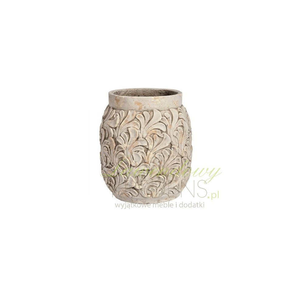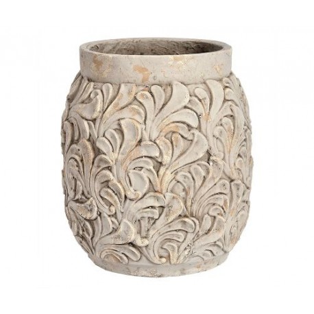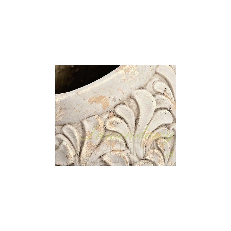 Wazon Belldeco w kształcie opasłego słoja, został ozdobiony wypukłymi dekoracjami przypominającymi liście. Naczynie pomalowano na biało a następnie zastosowano technikę odpryskiwania farby, co dodaje przedmiotowi wiekowości. Wazon, reprezentuje harmonijny styl prowansalski – pozwól się zaczarować!