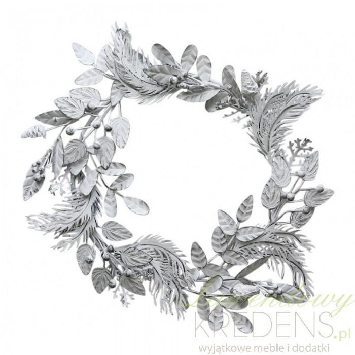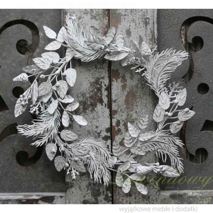 Metalowy wieniec to dekoracja wykonana z drobnych elementów uformowanych na kształt iglastych gałązek i listków.