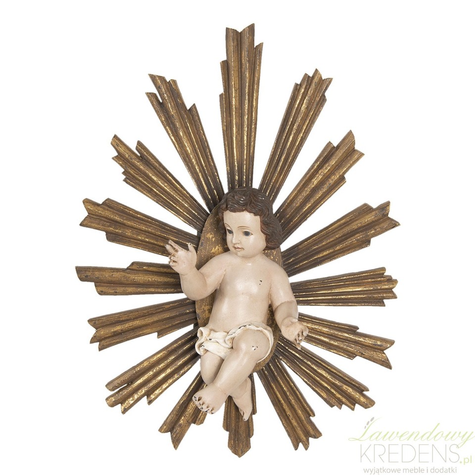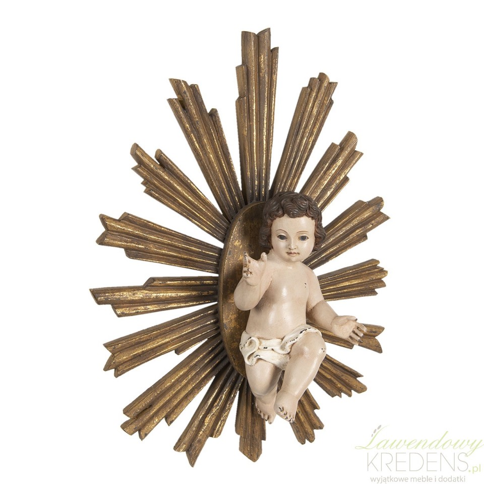 Oryginalna dekoracja bożonarodzeniowa ścienna z pewnością stanie się ulubieńcem Twojej rodziny na wiele lat. Ozdoba przedstawia dzieciątko na tle strzelistych promieni w kolorze starego złota. Udekoruj przestrzeń swojego wnętrza tą niezwykłą rzeźbą i zachwycaj się jej idealnym wyglądem. Ręcznie wykonana figurka wniesie do domu mnóstwo magii i bożonarodzeniowy klimat. Poczuj świąteczny nastrój wybierając wianki i dekoracje wiszące od marki Clayre & Eef!