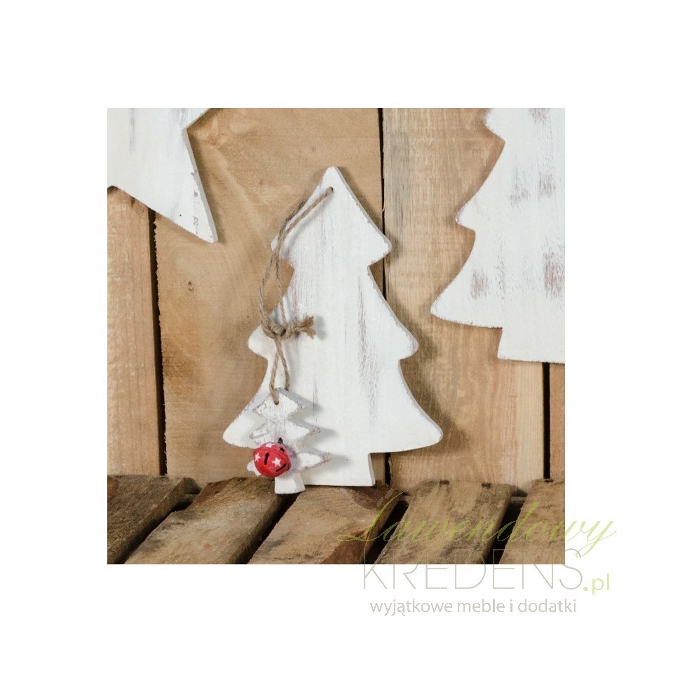 Drewniana zawieszka świąteczna w kształcie choinki zawieszonej na parcianym sznurku.