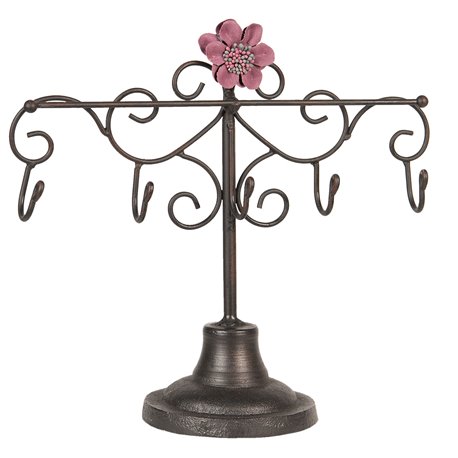 Zadbaj o swoją najcenniejszą biżuterię wykorzystując do tego metalowy stojak na biżuterię. Jednocześnie przechowuj i efektownie wyeksponuj pierścionki, łańcuszki i bransoletki. Praktyczny stojak wykonano z metalu, ozdobiono uroczo giętymi ramionami i rzeźbieniami. Na górze, pośrodku ramion znajduje się dekoracyjny kwiat w kolorze brudnego różu.