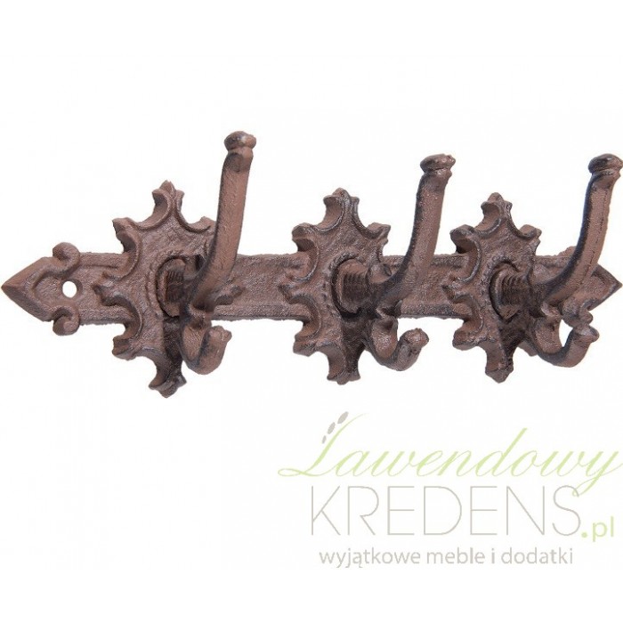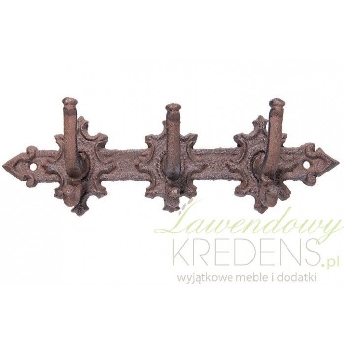 Wieszak żeliwny ma brązowy kolor. Ma trzy wieszaczki znajdujące się obok siebie. Idealny do łazienki czy kuchni. Wieszaki ścienne, a wśród nich żeliwne wieszaki to trwała i niezniszczalna dekoracja mieszkania.