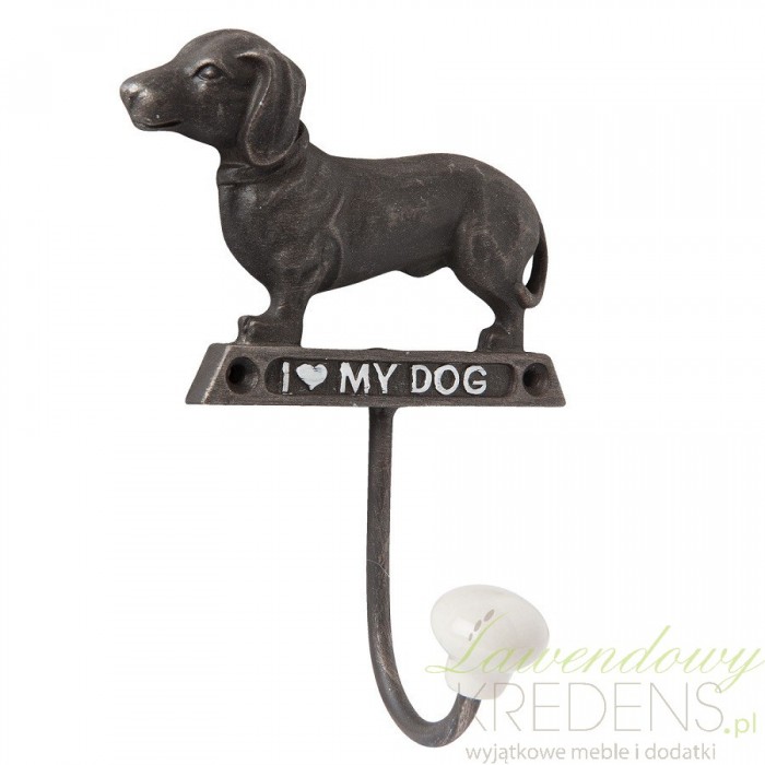Uroczy wieszak z psem może stanowić dekorację oraz praktyczny wieszak żeliwny. Pod figurką psa znajduje się podłużna tabliczka z białym napisem. Pod prostokątną tabliczką zamontowano pojedynczy haczyk zakończony białą gałką. Nic tak nie wpłynie na charakter Twojego wnętrza jak stylowe wieszaki ścienne w stylu prowansalskim z zwierzakami!