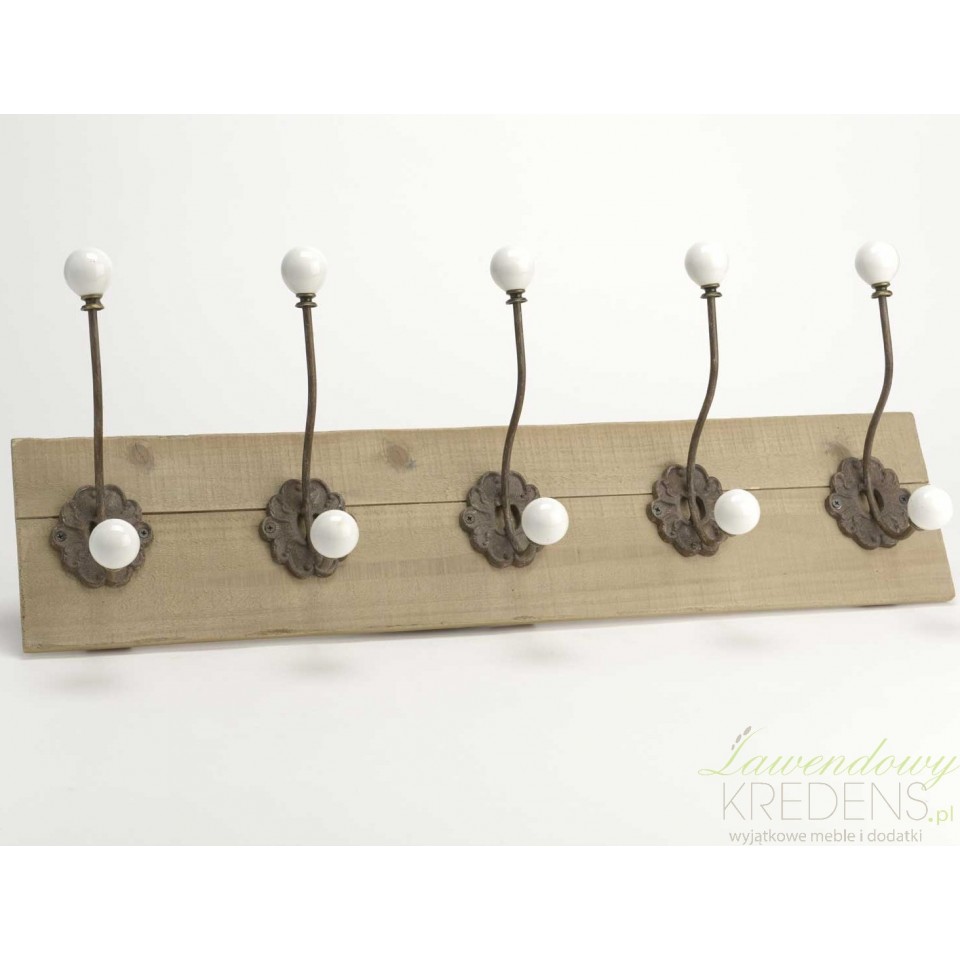 Wieszak w stylu prowansalskim na płaszcze lub inne elementy odzieży wierzchniej będzie z pewnością wyróżniał się w każdym korytarzu lub w przedpokoju. Podłużny wieszak można w bardzo prosty sposób przymocować do każdej ściany. Prowansalski wieszak ma brązowy kolor, wygląda jak zrobiony z dwóch desek i wyposażony jest w pięć metalowych haczyków zakończonych okrągłą gałką.