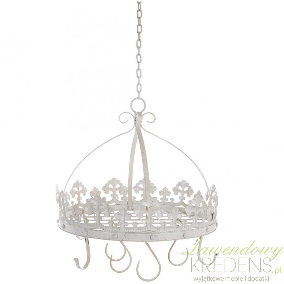 Półka zachwyca okrągłym kształtem i wykończeniem w kolorze antycznej bieli. Subtelne przetarcia i postarzenia nadają jej unikalny charakter, nawiązując do klimatu romantycznej Prowansji. Solidny łańcuch, na którym zawieszona jest półka, dodaje jej rustykalnego uroku, a praktyczne haczyki umieszczone poniżej pozwalają na wygodne przechowywanie drobnych przedmiotów.