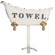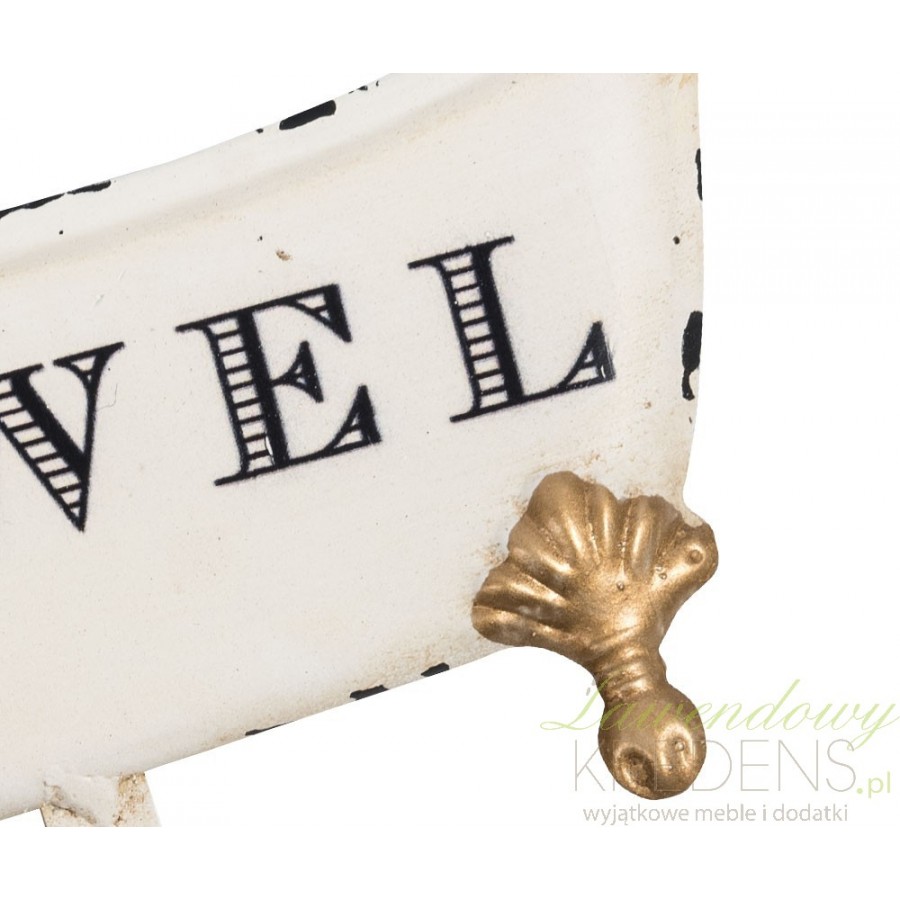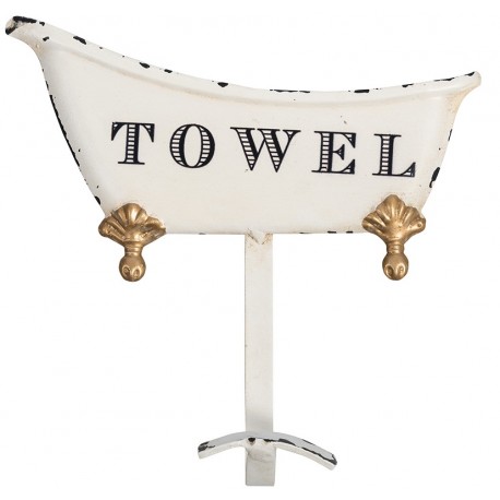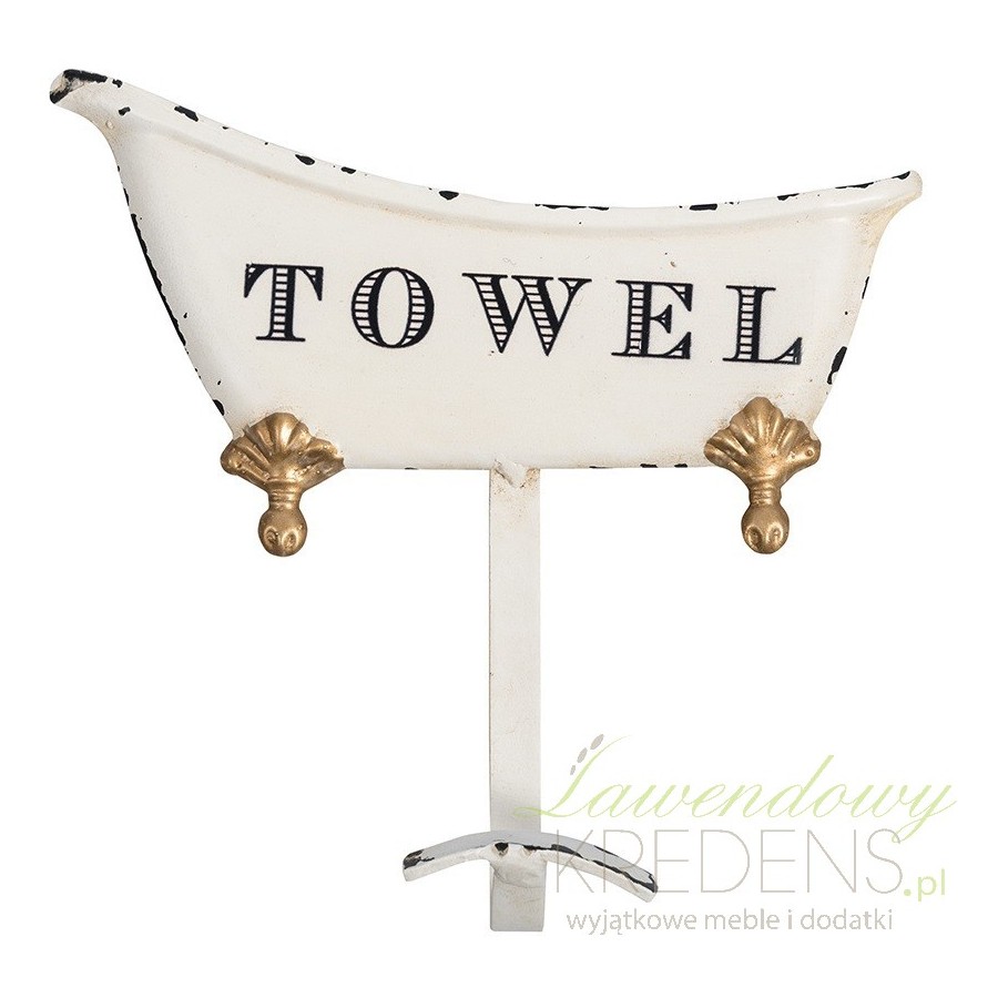 Wieszak do łazienki marki Belldeco został wykonany z metalu, pokrywy wartwą jasnej farby, ozdobiony napisem Towel i złotymi, dekoracyjnymi wstawkami. Całość dopełniają celowe zadrapania na powierzchni, dzięki czemu wieszak staje sę także stylowa dekoracją!