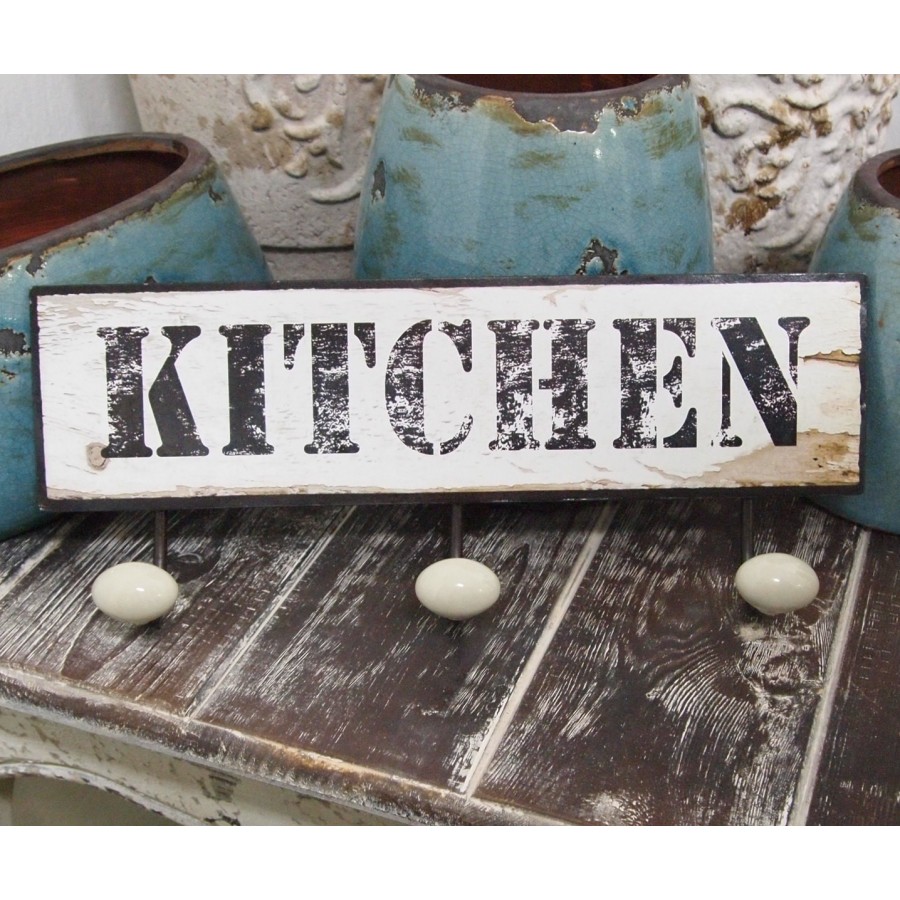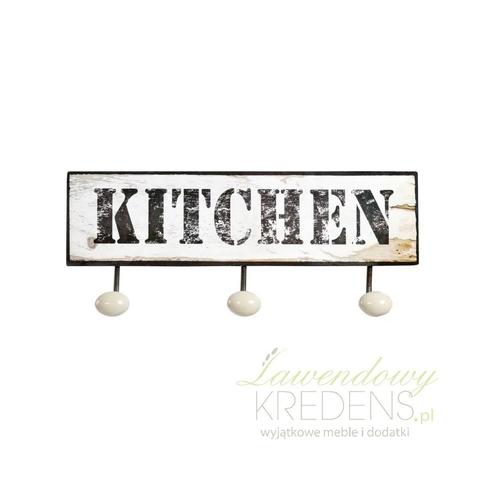 Metalowe wieszaki "Retro Wieszak 3 Kitchen" to wieszaki ścienne Belldeco wykonane techniką decoupage, które świetnie sprawdzą się w kuchni, a także jako dodatek do restauracji, baru lub kawiarni. Na wieszaku znajduje się przetarty, czarny napis KITCHEN na jasnym tle. Trzy wieszaczki także wykonane są z metalu, są więc trwałe i solidne.