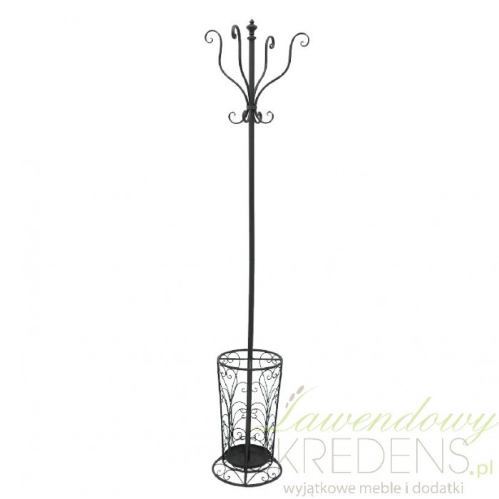 Czarny wieszak podłogowy został wykonany z metalu, a jego francuski urok podkreślają finezyjne wykucia metalowe.