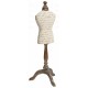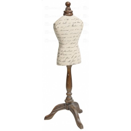 Śliczny manekin retro firmy Belldeco, który wykonany jest z bielonego drewna i obszyty beżowym materiałem. Na materiale znajduje się nadruk z odręcznymi, czarnymi napisami. Manekin jest pełną uroku dekoracją, którą można umieścić zarówno na meblu takim jak komoda czy konsola, jak i na podłodze.