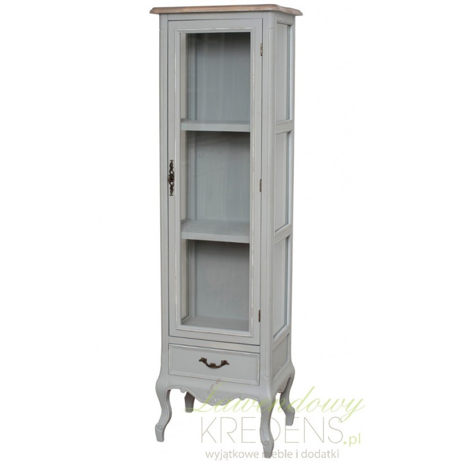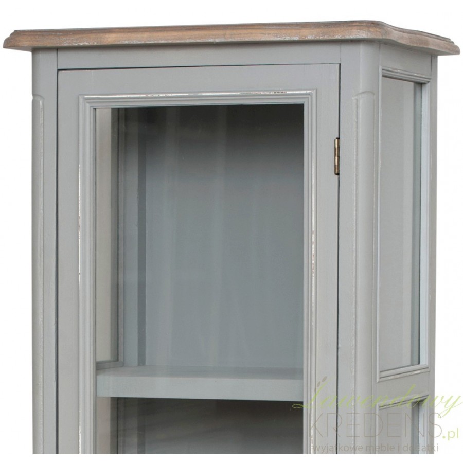 Wyglądająca nad wyraz gustownie i efektownie witryna prowansalska, której wnętrze jest doskonale widoczne dzięki przeszkleniom z trzech stron świata. Szara powierzchnia na zewnątrz i wewnątrz tego oryginalnego mebla świetnie podkreśli ustawione w niej przedmioty, nadając im salonowego wyglądu.