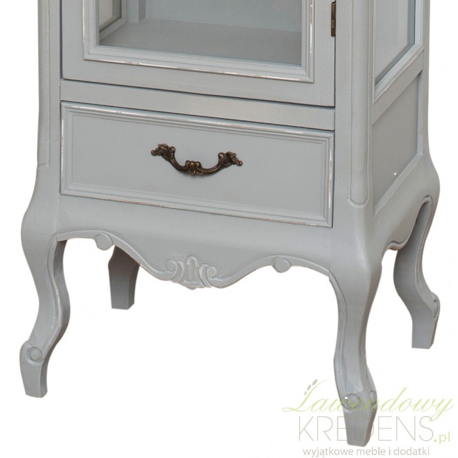 Przeszklona z trzech stron elegancka, szara witryna w stylu prowansalskim z fantastycznie wkomponowaną szufladą!