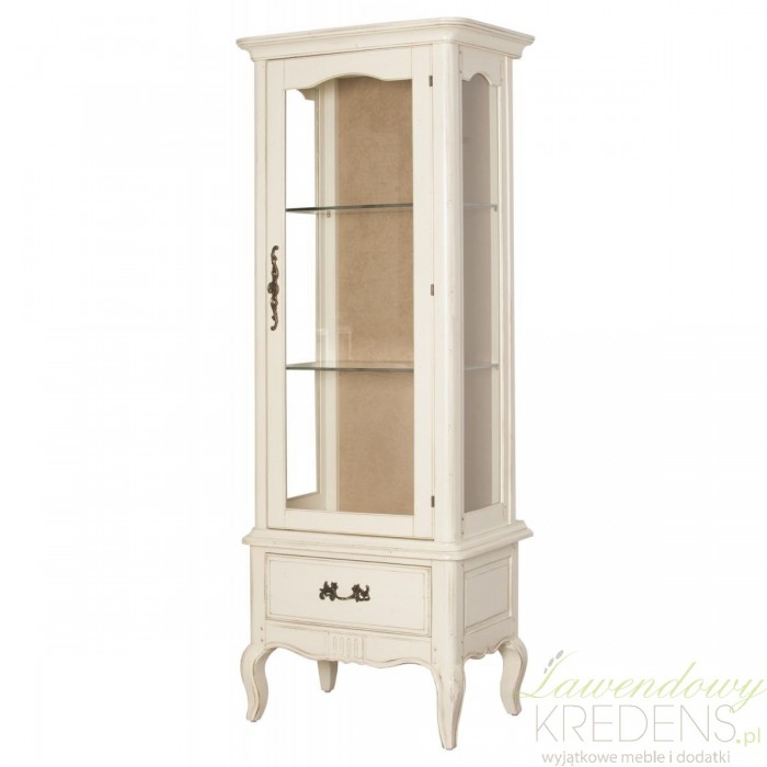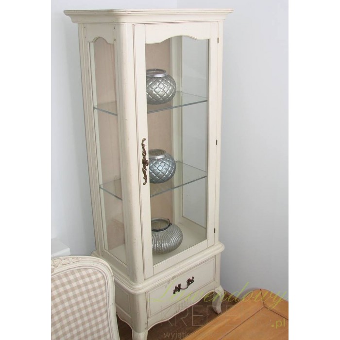 Meble w stylu francuskim wyróżniają się bogatymi zdobieniami i delikatną, finezyjną linią. Witryna w stylu francuskim z kolekcji Verona jest oszklona z trzech stron i posiada trzy półki i jedną szufladkę. Osadzona na krótkich, fantazyjnie wygiętych nóżkach jest śliczną ozdobą mieszkania. Kremowa witryna w stylu prowansalskim świetnie zaprezentuje się na wystawie np. w sklepie jubilerskim lub w dużym salonie.