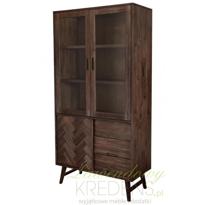 Wysoka i szeroka, brązowa witryna Livin Hill wykonana z drewna akacji to wyjątkowy mebel łączący w sobie elegancję i ciekawe, dość designerskie wzory na drzwiczkach. W górnej części znajdują się trzy półki zamkane za prostymi, przeszklonymi skrzydłami. W dolnej części witryna Ashton, ma zamontowane trzy szuflady z prostym wycięciem zamiast uchwytów i pojedynczą szafkę. Mebele Livin Hill prezentują się zajwiskowo! Ciemnobrązowe meble prowansalskie - polecamy!