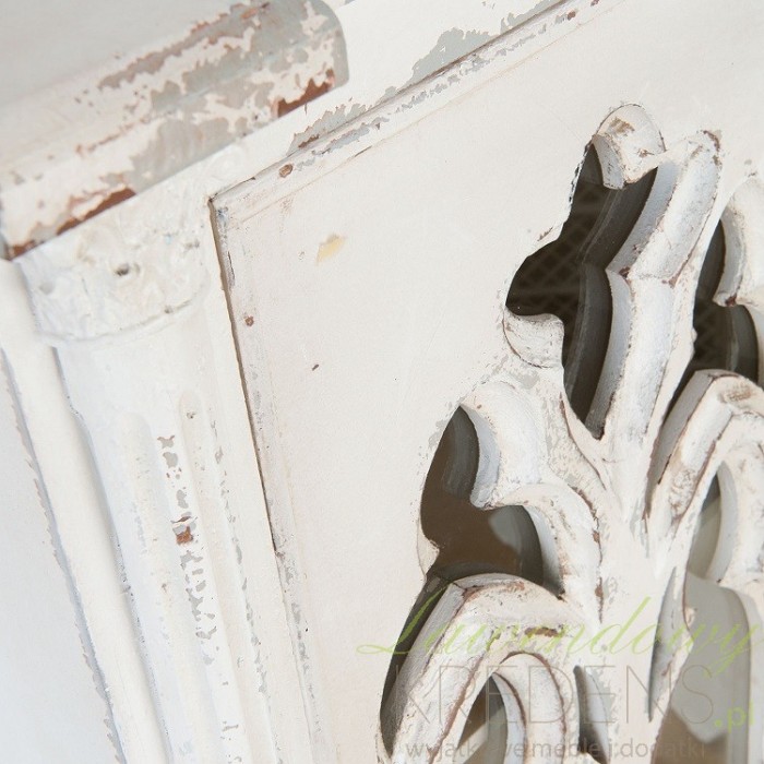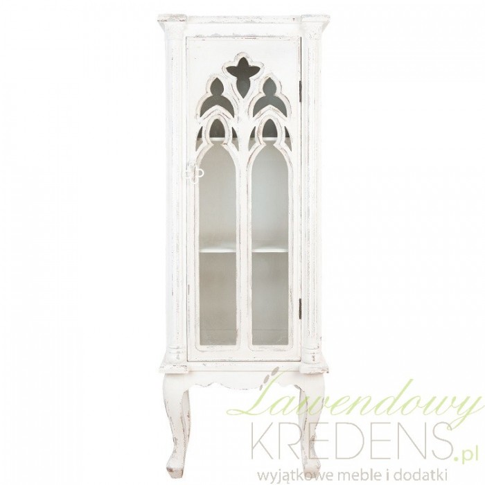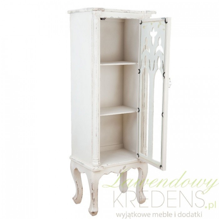 Witrynka w kolorze kremowym jest stylizowana na starą o czym świadczą prowansalskie kształty i przetarcia wykonane na krawędziach oraz blacie mebla. Wewnątrz witryny znajdują się dwie półeczki, których zawartość odkrywają dekoracyjne drzwiczki ze szkłem. Ten drewniany mebel ustawiony jest na wygiętych nóżkach, które łączą drewniane rzeźbienia. Marzysz o pięknym wnętrzu ale nie możesz znaleźć mebla, który sprawdzi się jako miejsce do przechowywania i jednocześnie jako dekoracja? Wybierz przecierane meble w stylu prowansalskim i mieszkaj tak jak lubisz!