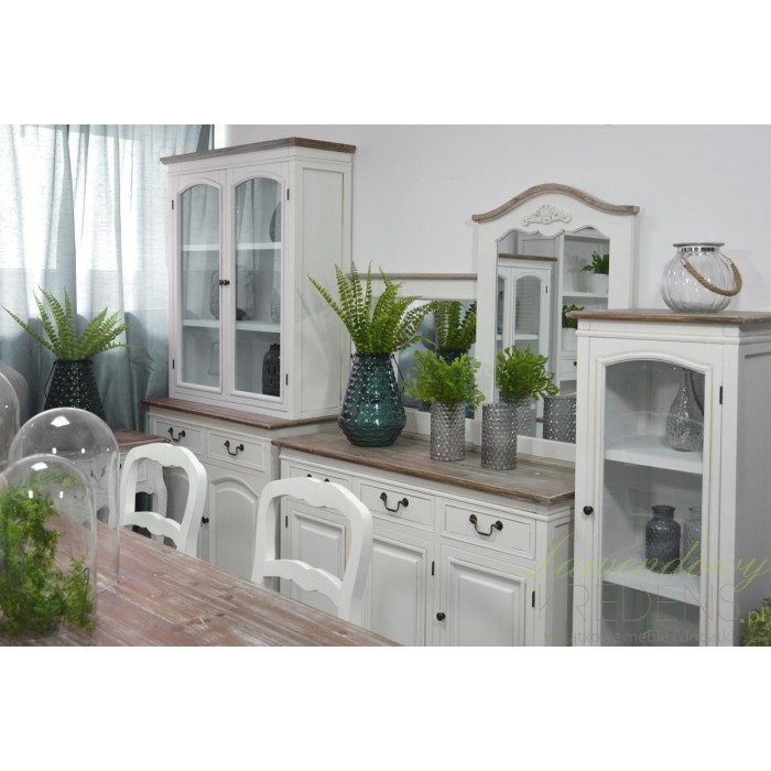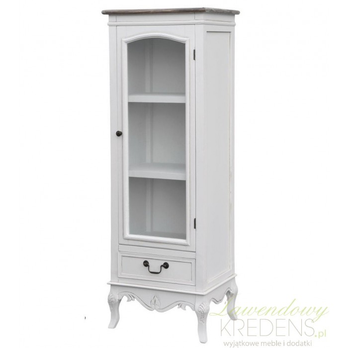 Pełna uroku, biała witryna w stylu prowansalskim marki Livin Hill. Boczne ściany witryny są pełne, a przeszklone są jadynie drzwiczki. W dolnej części witryny znajduje się szuflada, a na nóżkach i pod szufladą urokliwe rzeźbienia. Warto zwrócić uwagę na fakt, że witryna nie jest bardzo wysoka, jej wysokość to 133cm, co dodaje jej lekkości.