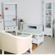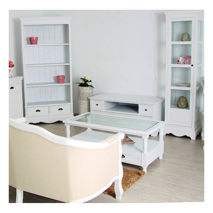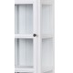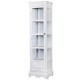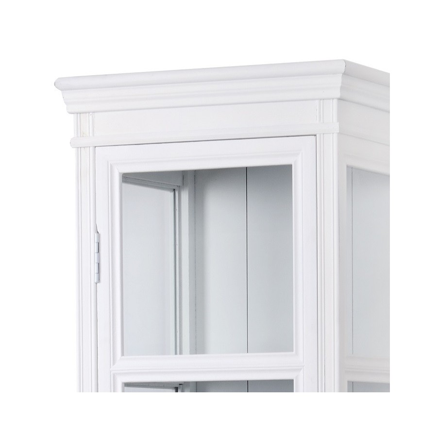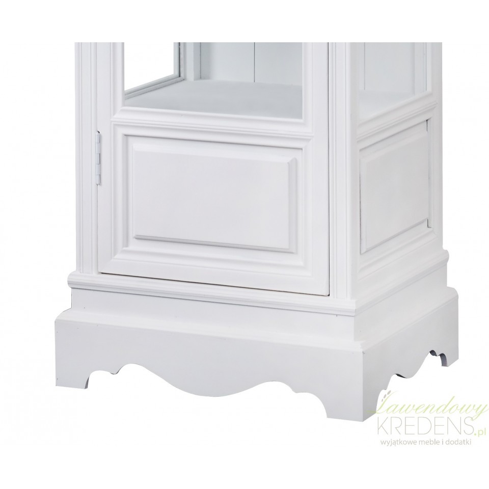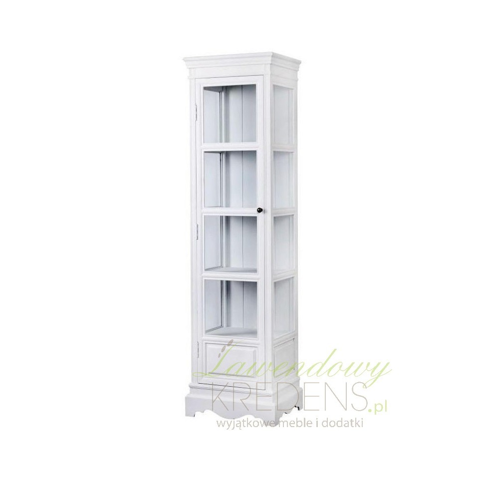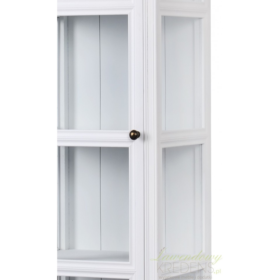 Biała witryna prowansalska z przeszklonymi bokami i drzwiczkami.