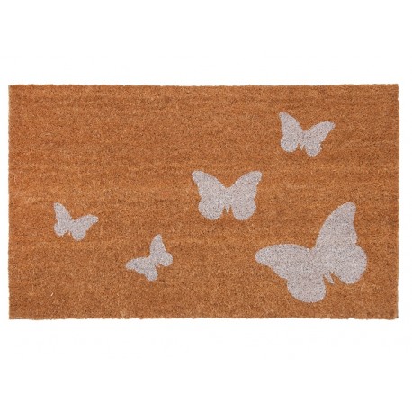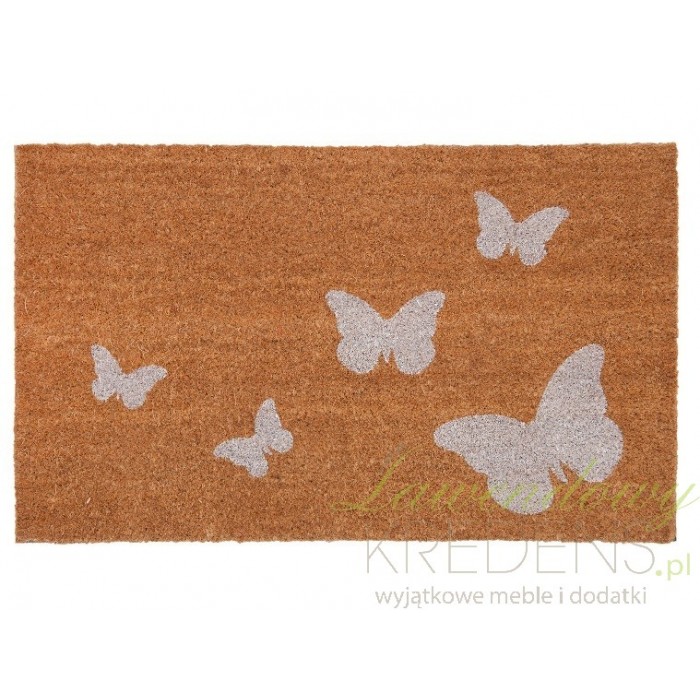 Wycieraczka kokosowa posiada duży motyw białych motyli w różnych rozmiarach. Wycieraczka w motyle wykonana jest z brązowego kokosu i stanowi niezbędny przedmiot do dbania o porządek w domu. Wycieraczka z motylami firmy Clayre & Eef to świetny wybór. Zapraszamy do zakupu!