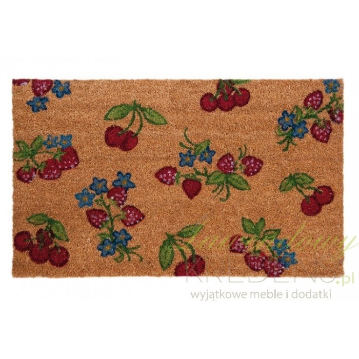 Wycieraczka z owocami firmy Clayre & Eef to piękna inspiracja zdrowym trybem życia. Poprawi nastrój i wprawi w pozytywne myślenie znajomych i rodzinę. Wycieraczka kokosowa udekorowana jest dużą ilością kolorowych owoców takich jak: truskawki i wiśnie. Nieodłącznym elementem ozdobnym są także niezapominajki. Wycieraczki kokosowe to najchętniej kupowane wycieraczki pod drzwi.
