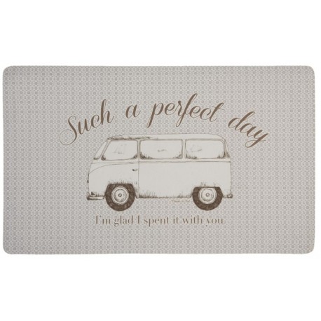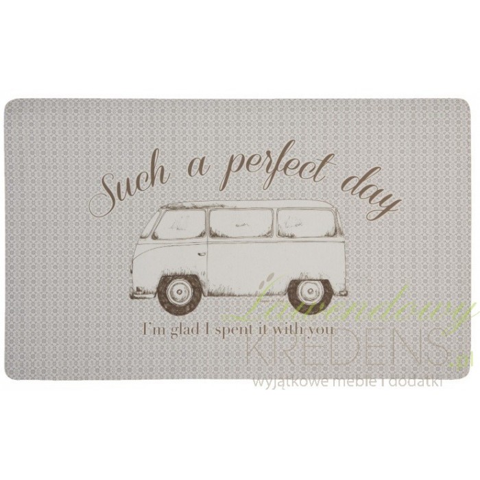 Wycieraczki do wewnątrz to świetny sposób na ozdobienie swojego domu w sposób oryginalny. Wycieraczka wewnętrzna firmy Clayre & Eef ma kolor beżowy. Na środku narysowany jest duży samochód, a na górze duży angielski napis Such a perfect day. Wycieraczka z napisami może posłużyć na postawienie butów, czy innych rzeczy.
