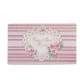Różowa wycieraczka prowansalska ma oryginalny wzór w białe, koronkowe paski i duże serce z napisami.