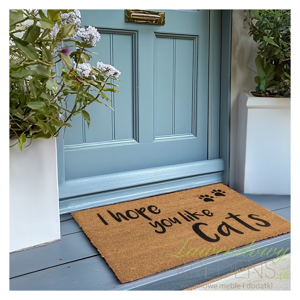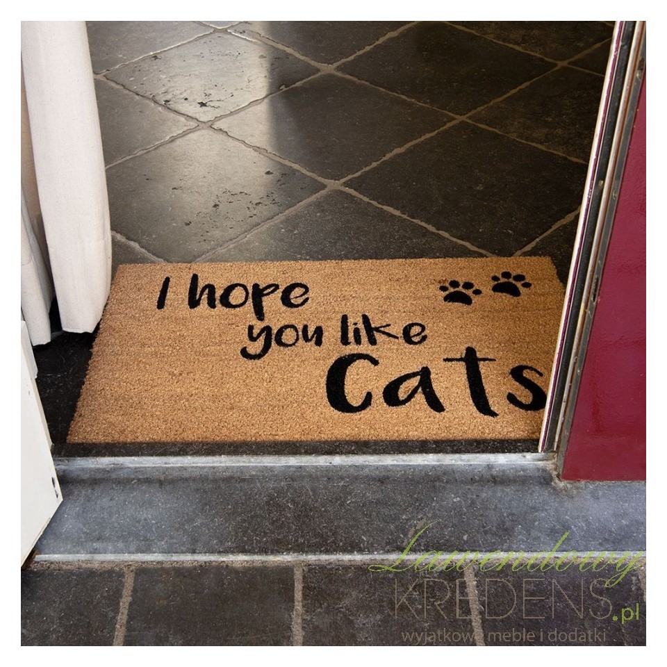 Wycieraczka kokosowa z angielskim napisem "I hope you like cats" ma kształt prostokąta i wymiar 75x45 centymetrów. Wycieraczka od Clayre&Eef usuwa większe zbarudzenia z obuwia, takie jak śnieg, piasek i błoto. Produkt skutecznie pomaga zadbać o czystość w całym domu. Wycieraczki kokosowe polecamy do użytku wewnętrznego.