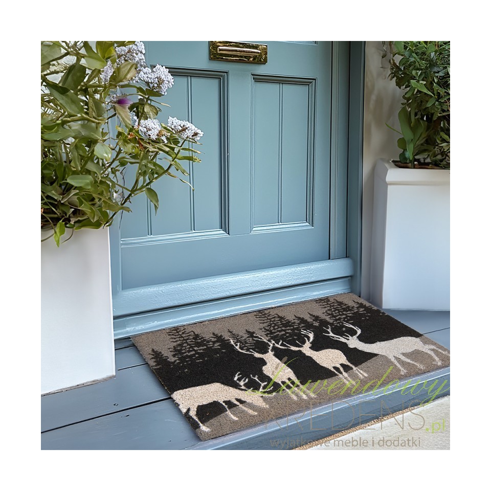 Ta stylowa wycieraczka do ogrodu, mieszkania, na taras lub balkon z motywem jeleni marki Clayre & Eef zachwyca wyjątkowym designem, który wprowadza do strefy wejściowej nutę natury i spokoju. Jej niebanalny wzór przedstawiający leśną scenerię z majestatycznymi jeleniami doskonale podkreśli charakter Twojego domu. Proponowana wycieraczka do mieszkania idealnie sprawdzi się nie tylko przy wejściu do ogrodu, ale także na tarasie, ganku lub przed drzwiami wejściowymi, tworząc eleganckie pierwsze wrażenie.