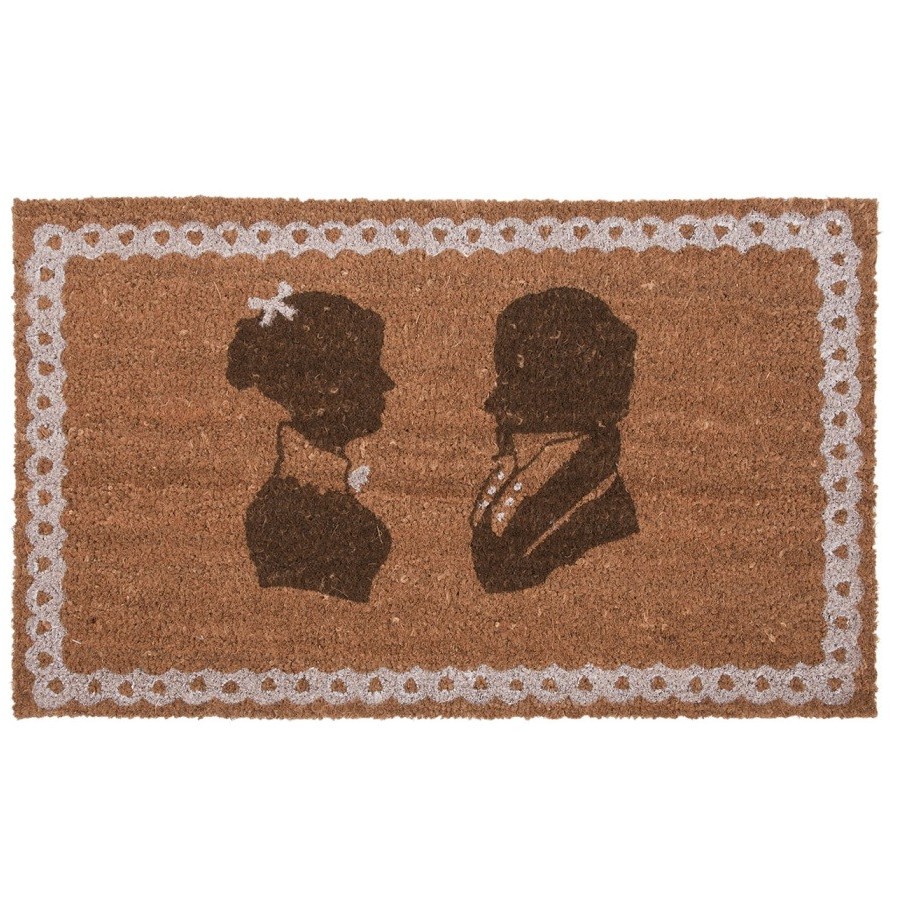 Ładnie wykonana wycieraczka w stylu francuskim z grafiką przedstawiającą elegancką parę.
