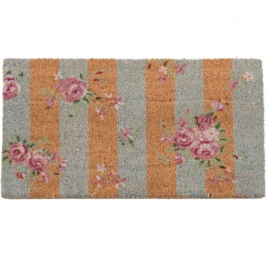 Prostokątne wycieraczki prowansalskie, przeplatane szarymi i pomarańczowymi paskami tworzywa, pięknie wpasują się w Twoje mieszkanie, nadając mu barw. Gustowna dekorację przedmiotu wzbogacają kolorowe różyczki rozsypane na powierzchni wycieraczki. Piękne!