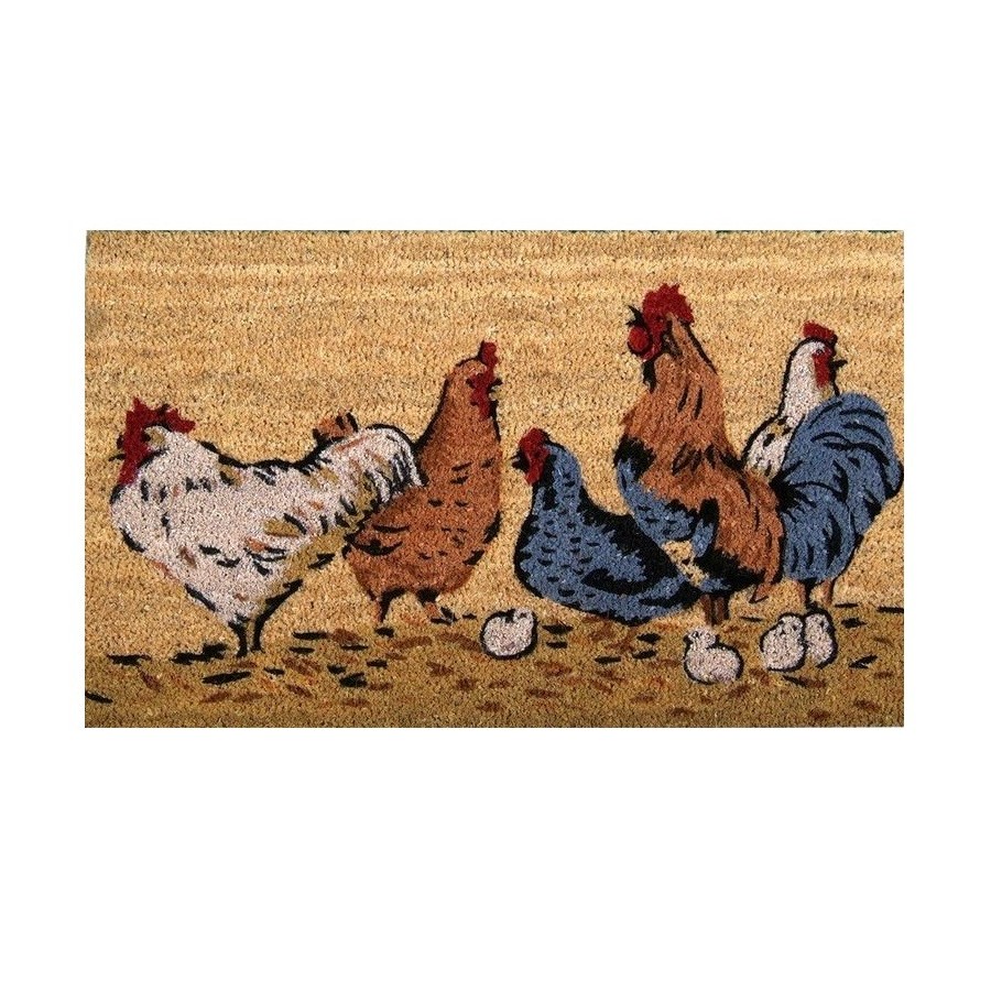 Efektownie wyglądające wycieraczki z kolorowymi, swodobnie biegającymi kurami. Wspaniały styl rustykalny.