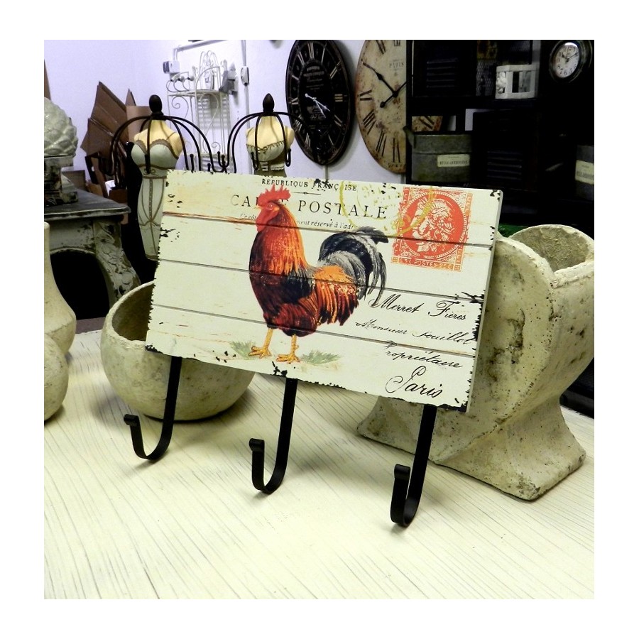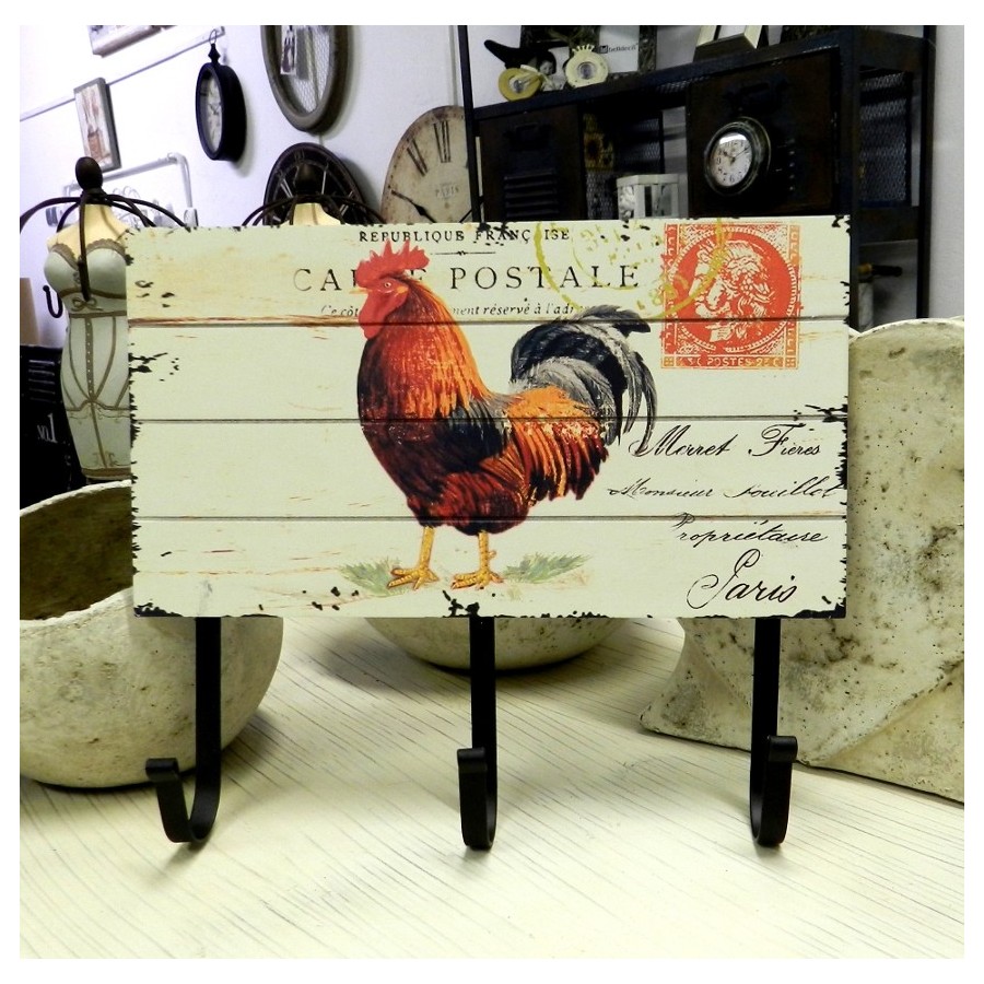Pełen uroku wieszak w stylu prowansalskim z kogutem, którego ozdobna tabliczka wykonana jest z drewna, a trzy czarne wieszaczki z metalu. Wieszak jest idealny dla każdego, kto lubi styl prowansalski oraz prowansalskie dekoracje z kogutem. Na ozdobnej tabliczce wieszaka oprócz koguta znajduje się czerwona pieczątka, stempel, napis CARTE POSTALE oraz odręczne napisy.