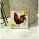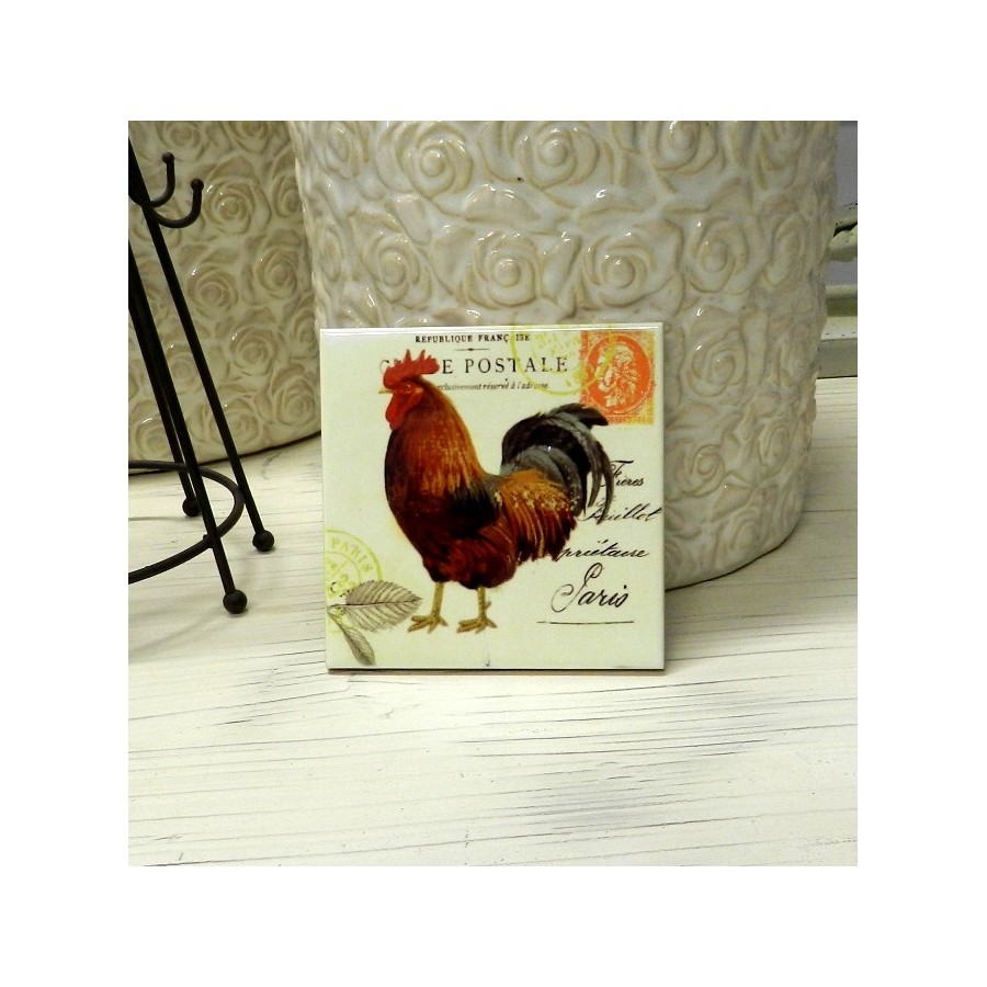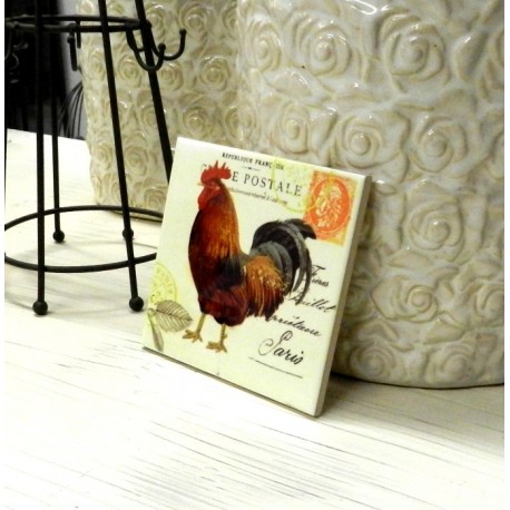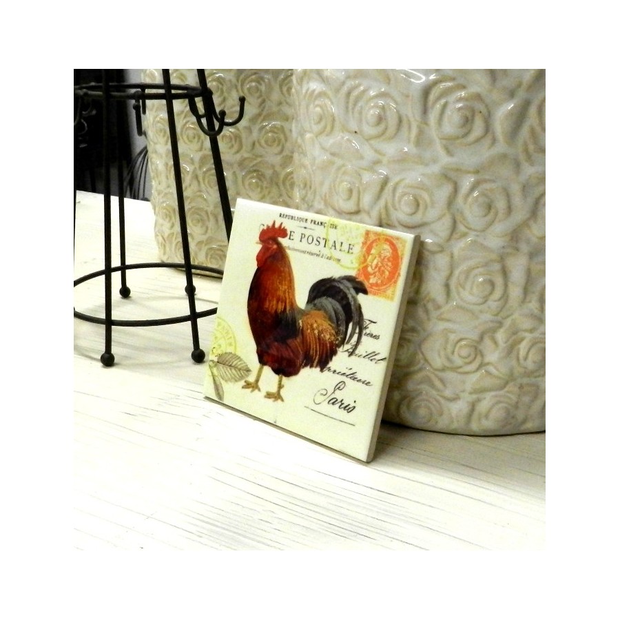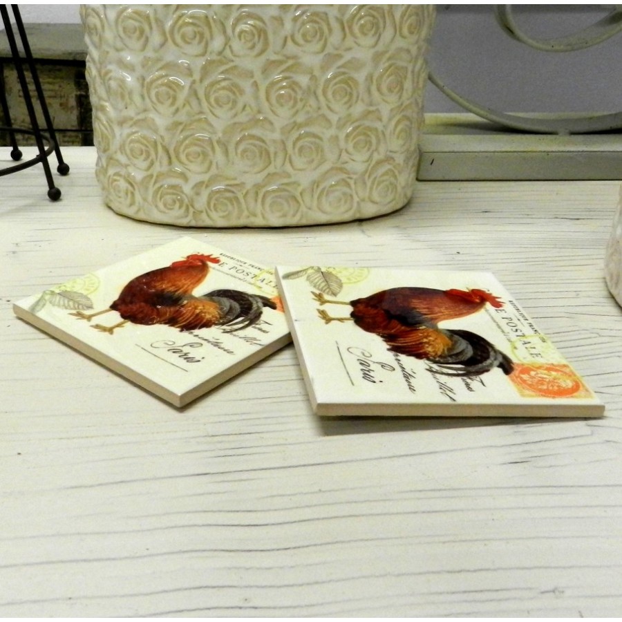 Jasne, ceramiczne kafle z kogutem to piękne prowansalskie dekoracje, które idealnie sprawdzą się jako podkładki stołowe.