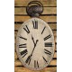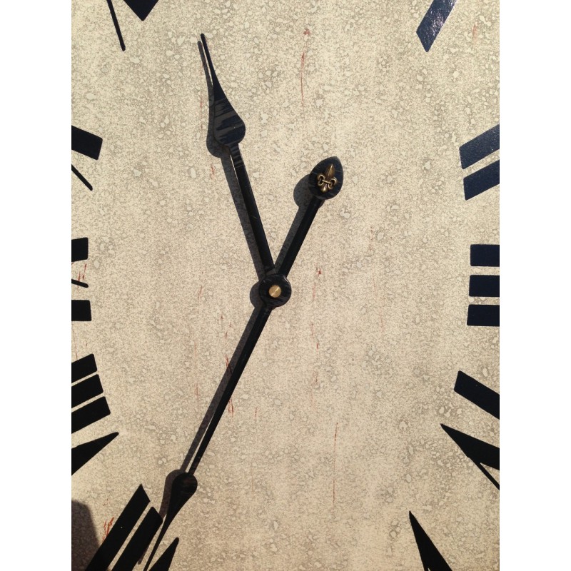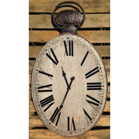 Szary, prowansalski zegar Belldeco o owalnym kształcie z rdzawymi przecierkami i dużymi, czarnymi cyframi rzymskimi.