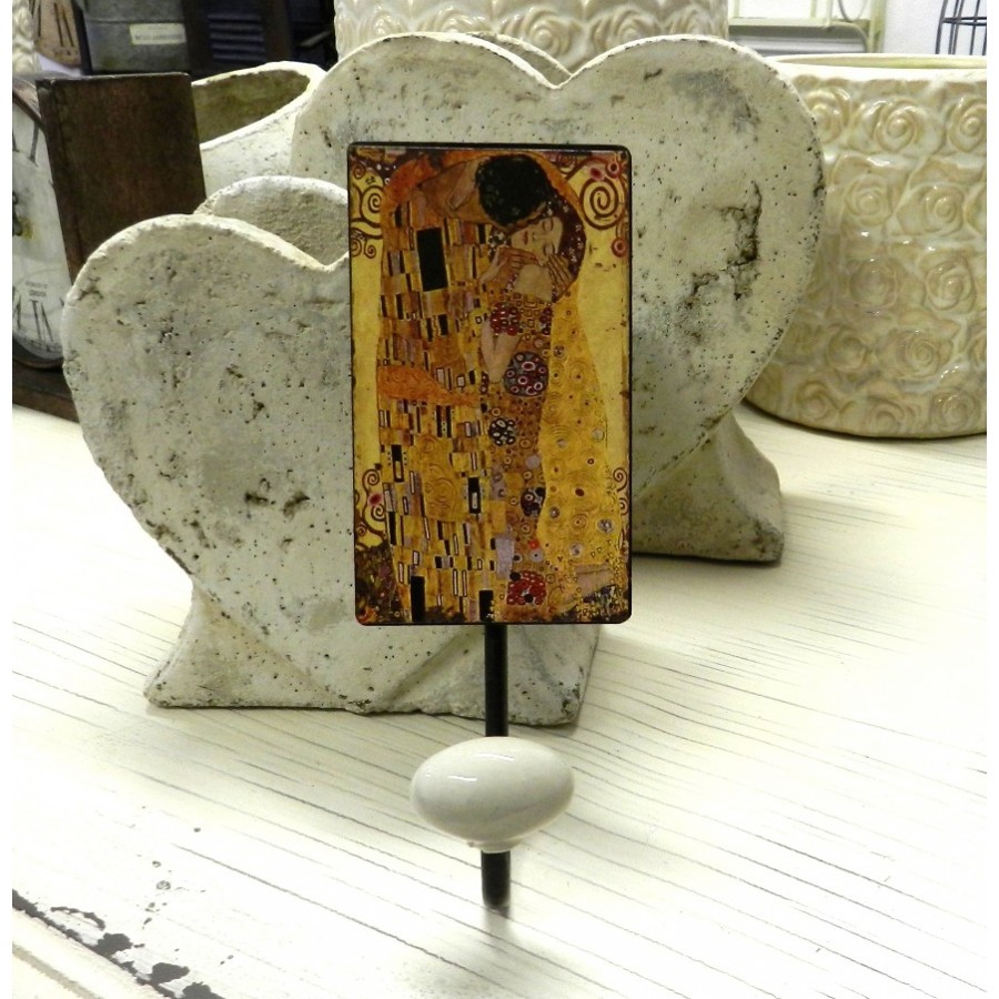 Wieszak do łazienki Giustav Klimt, to wyjątkowa propozycja, przeznaczona dla wielbicieli ładnych i funkcjonalnych przedmiotów o niecodziennym charakterze. Wieszaczek posiada zgrabny hak, zakończony ładną białą kuleczką. Atutem wieszaka jest jego zdobienie. Na płytce umieszczono reprodukcję secesyjnego obrazu „Pocałunek” autorstwa Giustava Klimta. Obrazek przedstawia zatraconą w miłosnym objęciu parę, tuż na skraju ukwieconej łąki. Zakochani ubrani w złote szaty, zostali uchwyceni na kilka chwil przed pocałunkiem. Piękny, niebanalny przedmiot!