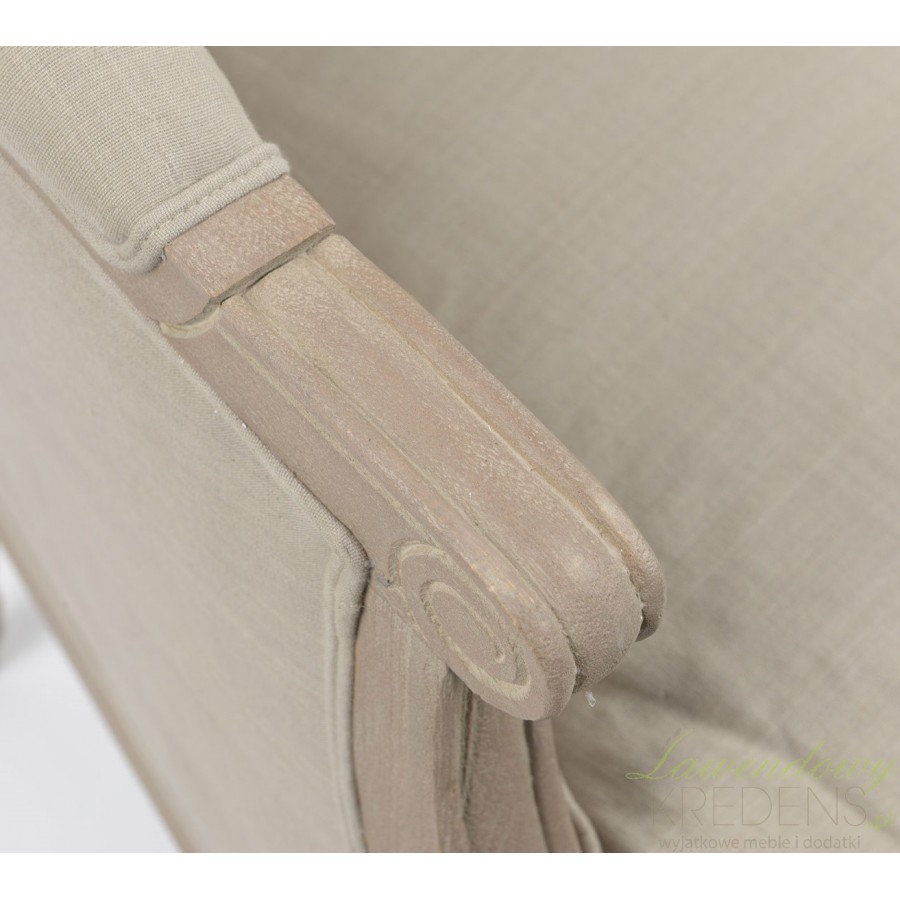 Klasyczne fotele w stylu prowansalskim z zabudowanymi oparciami i dodatkowo obitymi materialem podłokietnikami. Jasna tapicerka genialnie komponuje się z kolorem drewnianych elementów, a dopasowana poduszka zapewnia komfort siedzenia i wypoczynku.