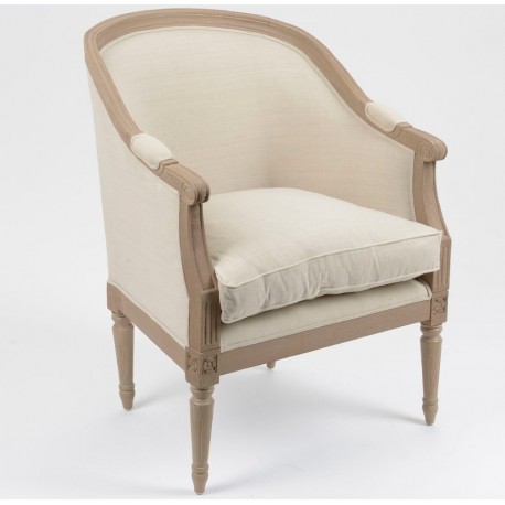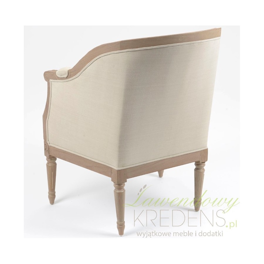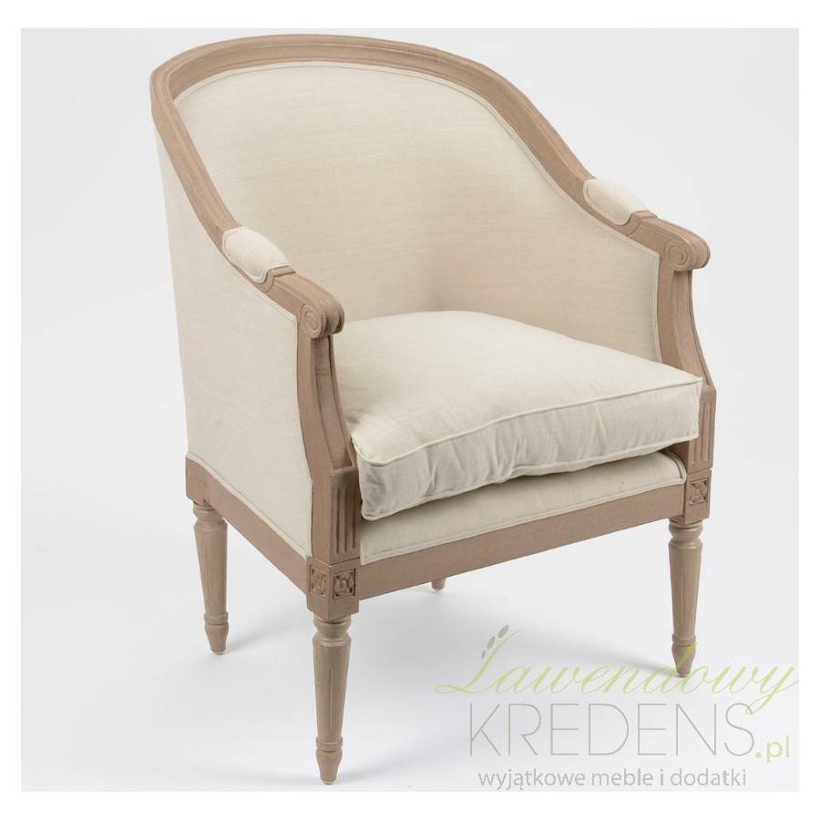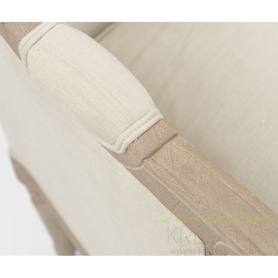 Drewniany fotel w stylu prowansalskim z lnianą, beżową tapicerką, podkreślającą styl i klasę! Polecamy!