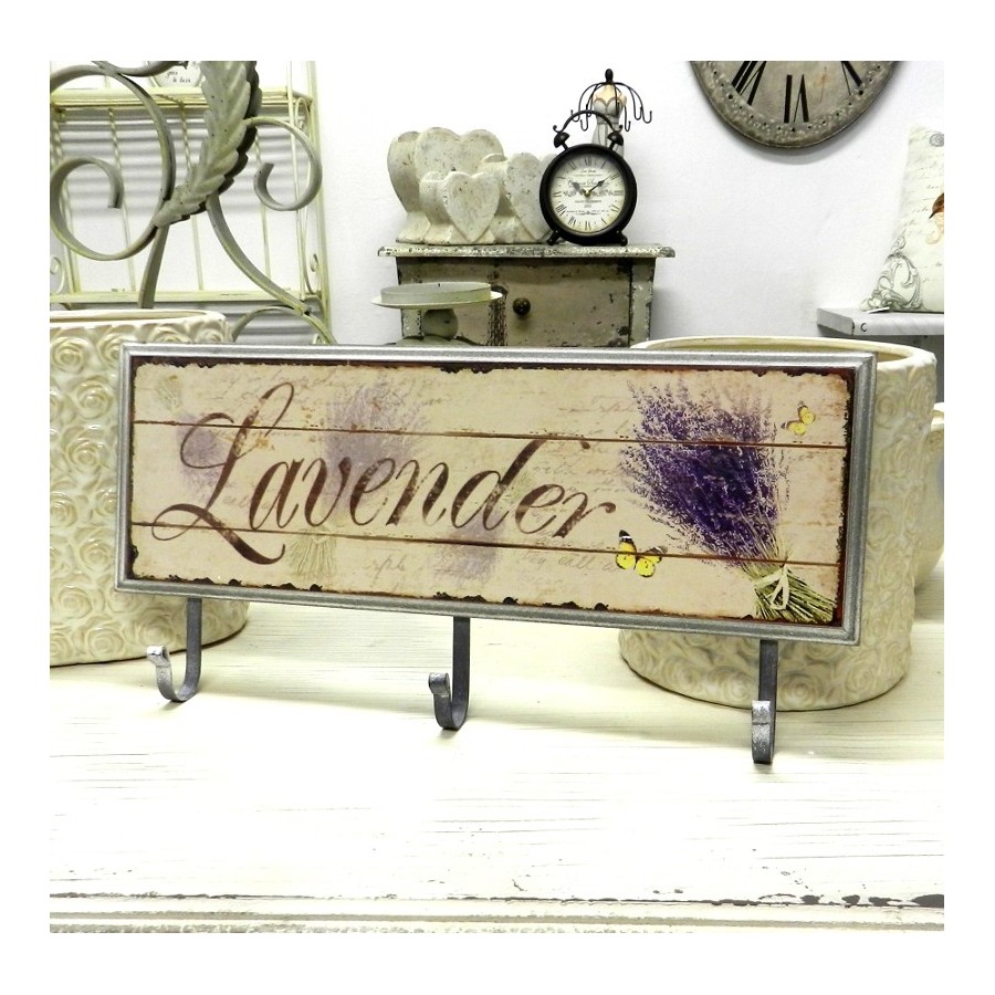Duży wieszak Prowansja to piękny, prowansalski wieszak Belldeco, którego prostokątna tabliczka wykonana jest z drewna i ozdobiona grafiką, na której znajduje się lawenda z motylkiem oraz napis Lavender. Trzy wieszaczki wykonane są z metalu.