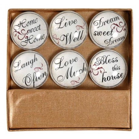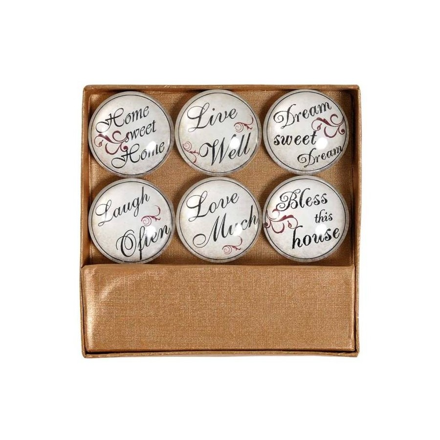 Zestaw Retro Magnes Biały napisy to komplet z sześcioma uroczymi, wypukłymi magnesami Belldeco na których znajdują się czarne napisy.