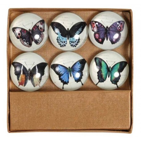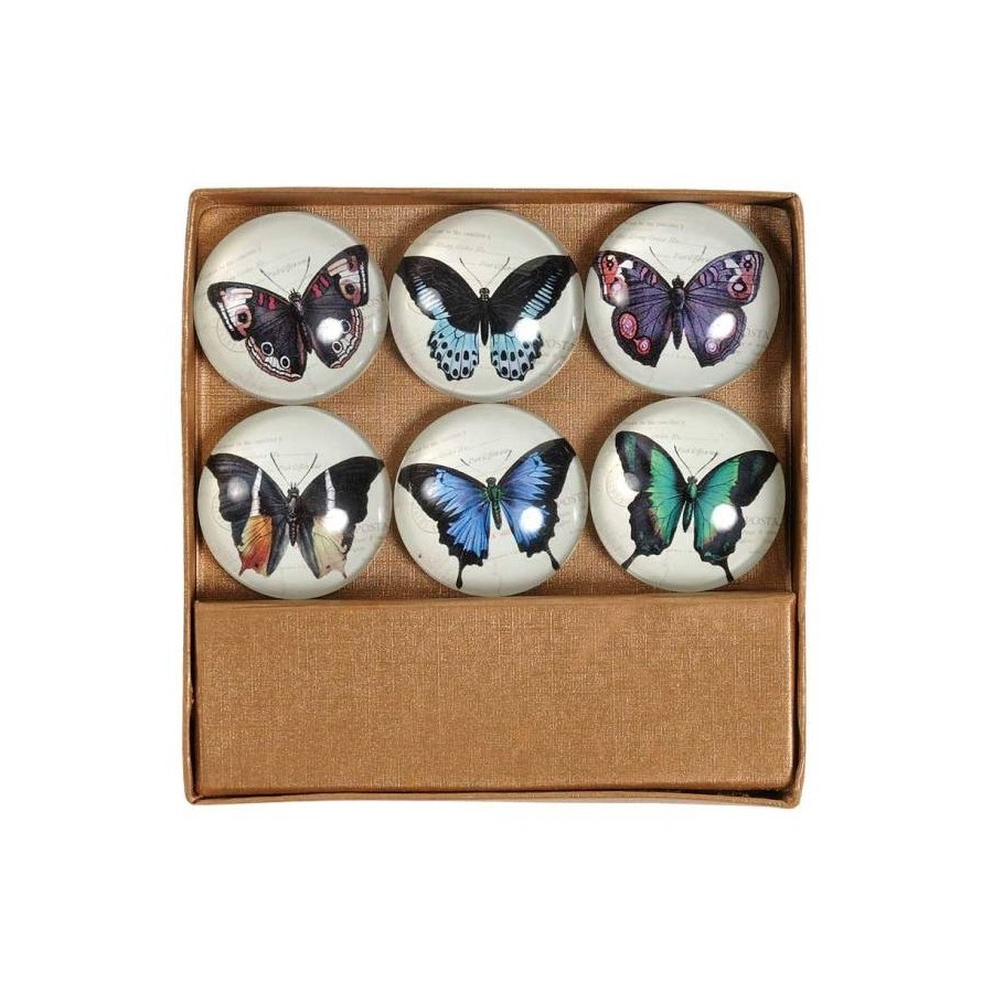 Śliczne magnesy na lodówkę z kolorowymi motylami, czyli komplet sześciu magnesów Belldeco w pudełeczku.