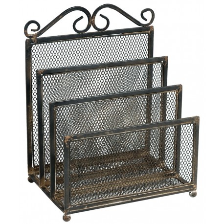 Stojak na gazety Belldeco wykonany z pomalowanego na czarno metalu, na którym widoczne są rdzawe przetarcia.