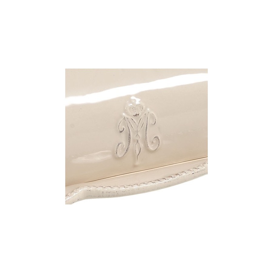 Nicea maselnica to elegancka, ceramiczna maselnica Belldeco. Podstawka maselnicy Nicea ma elegancki kształt, natomiast na pokrywce znajduje się wypukły wzór. Na krawędziach podstawki, wypukłym dekorze oraz uchwycie służącym do podnoszenia pokrywki znajdują się szare przetarcia.